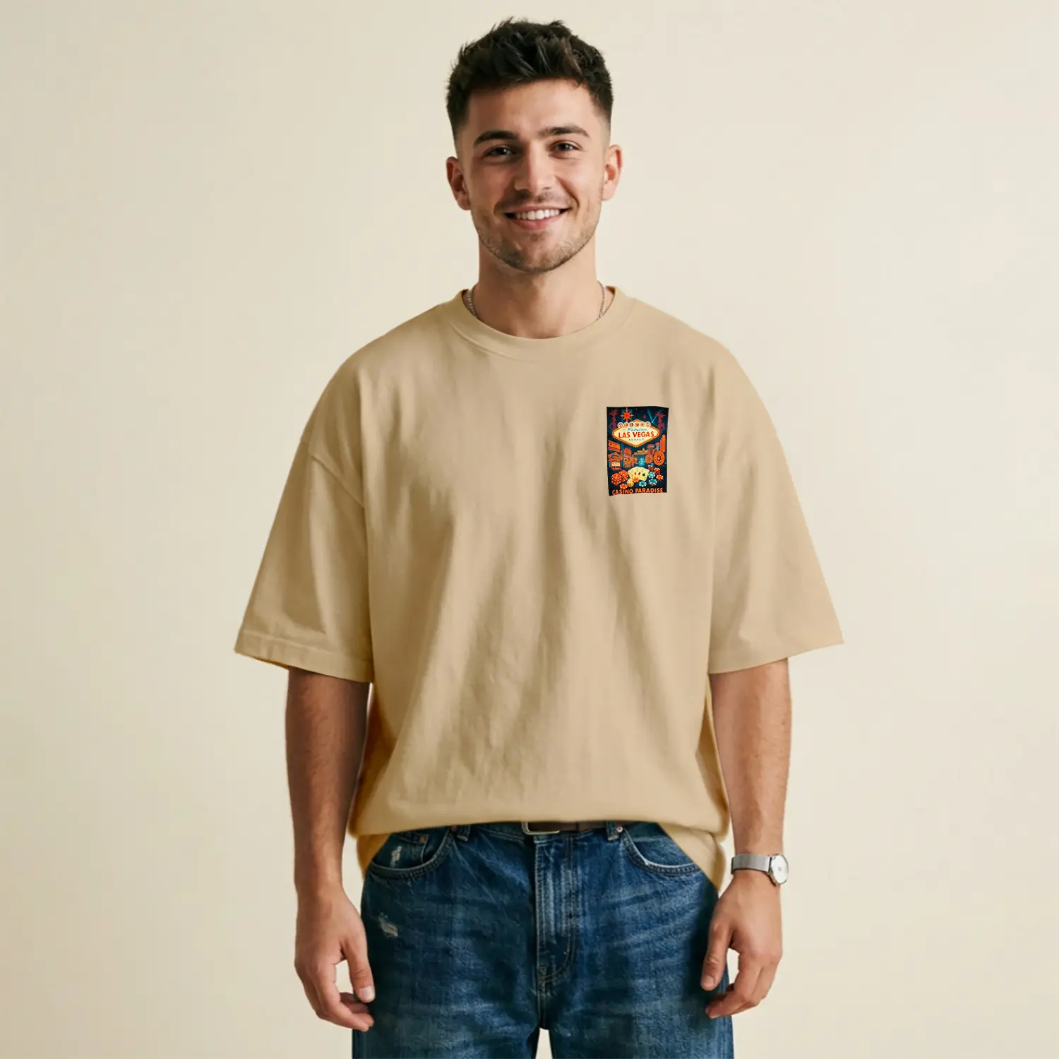 Kırmızı Beyaz Grafik Desenli Bej Baskılı Erkek Tişört