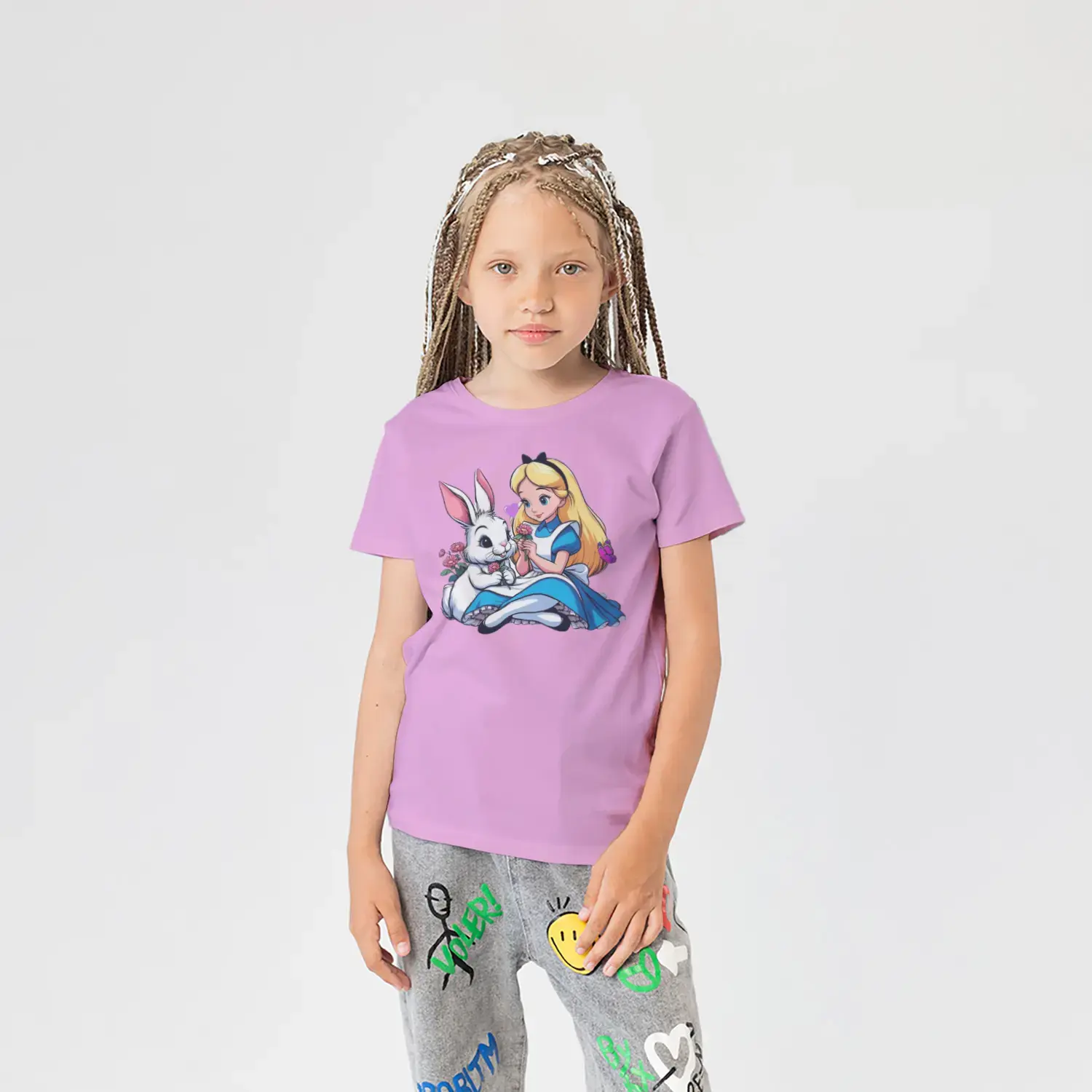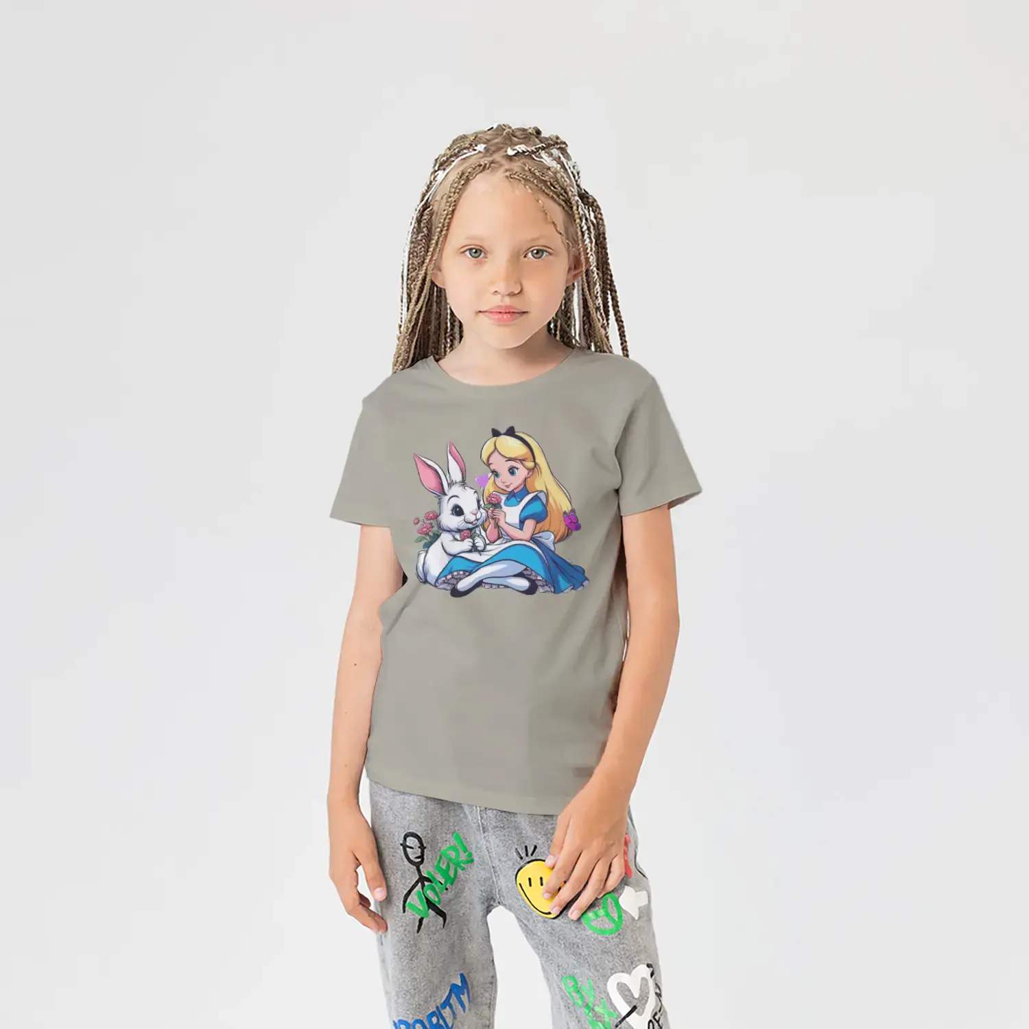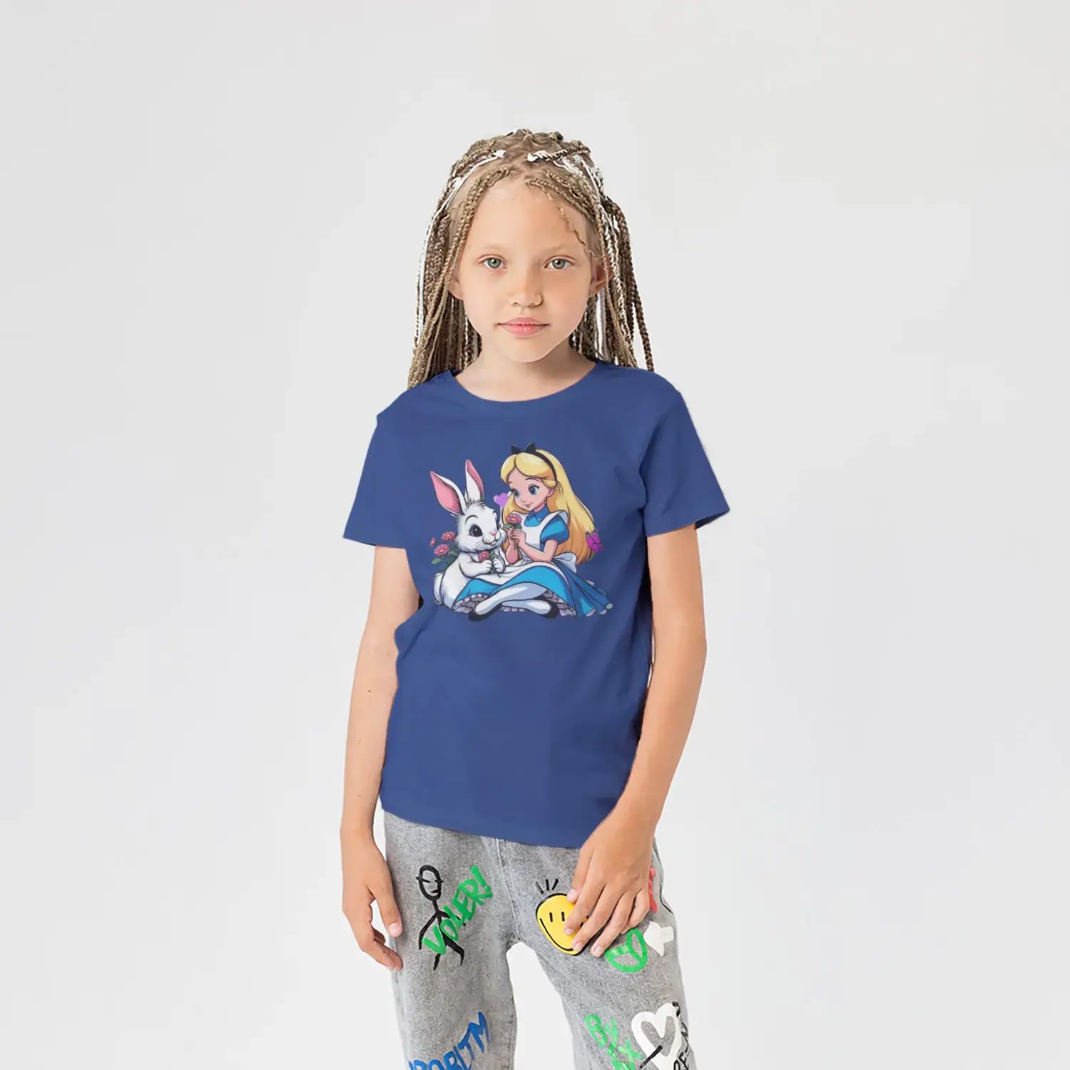 Mavi Elbiseli Sarışın Kız ve Beyaz Tavşan Baskılı Kız Çocuk Tişörtü