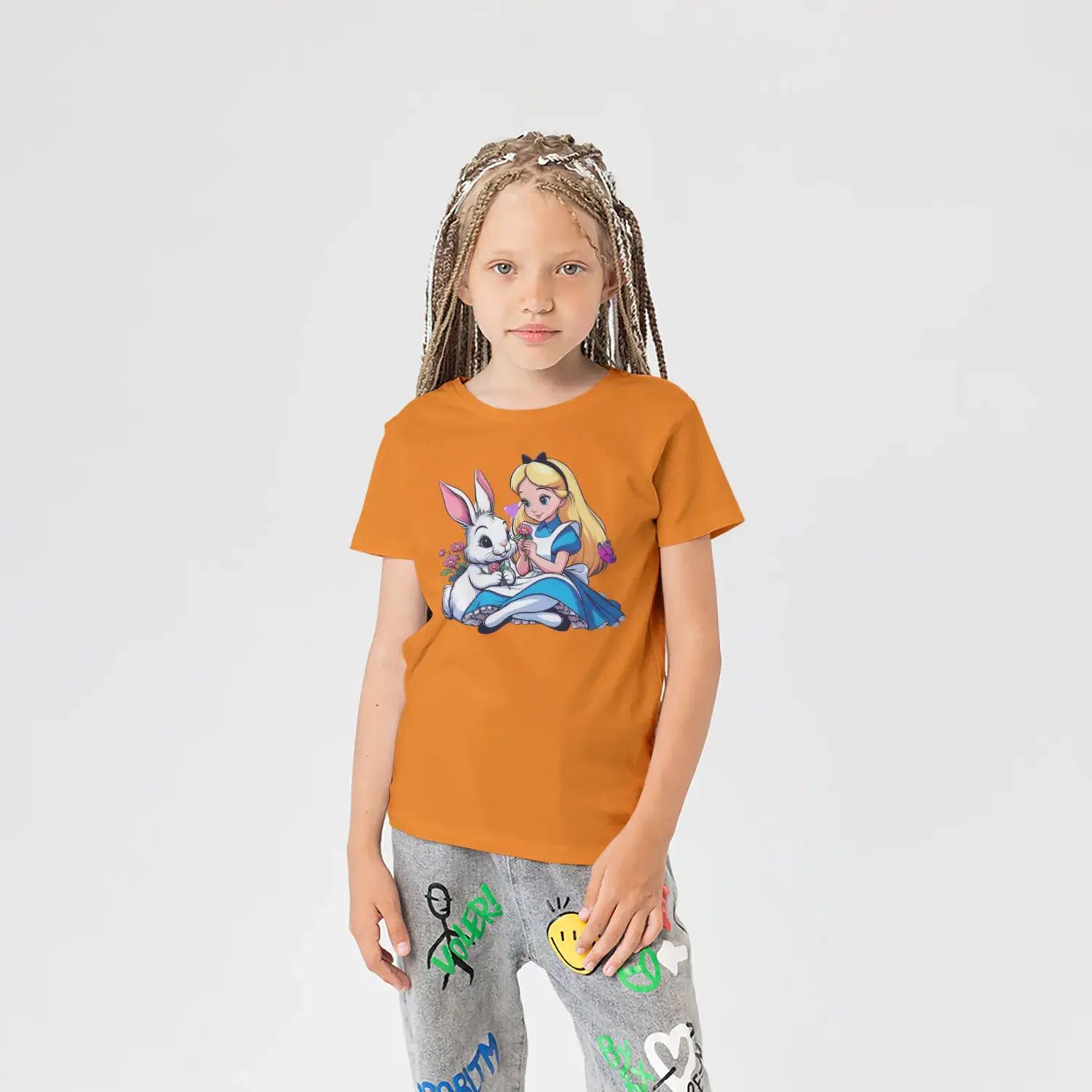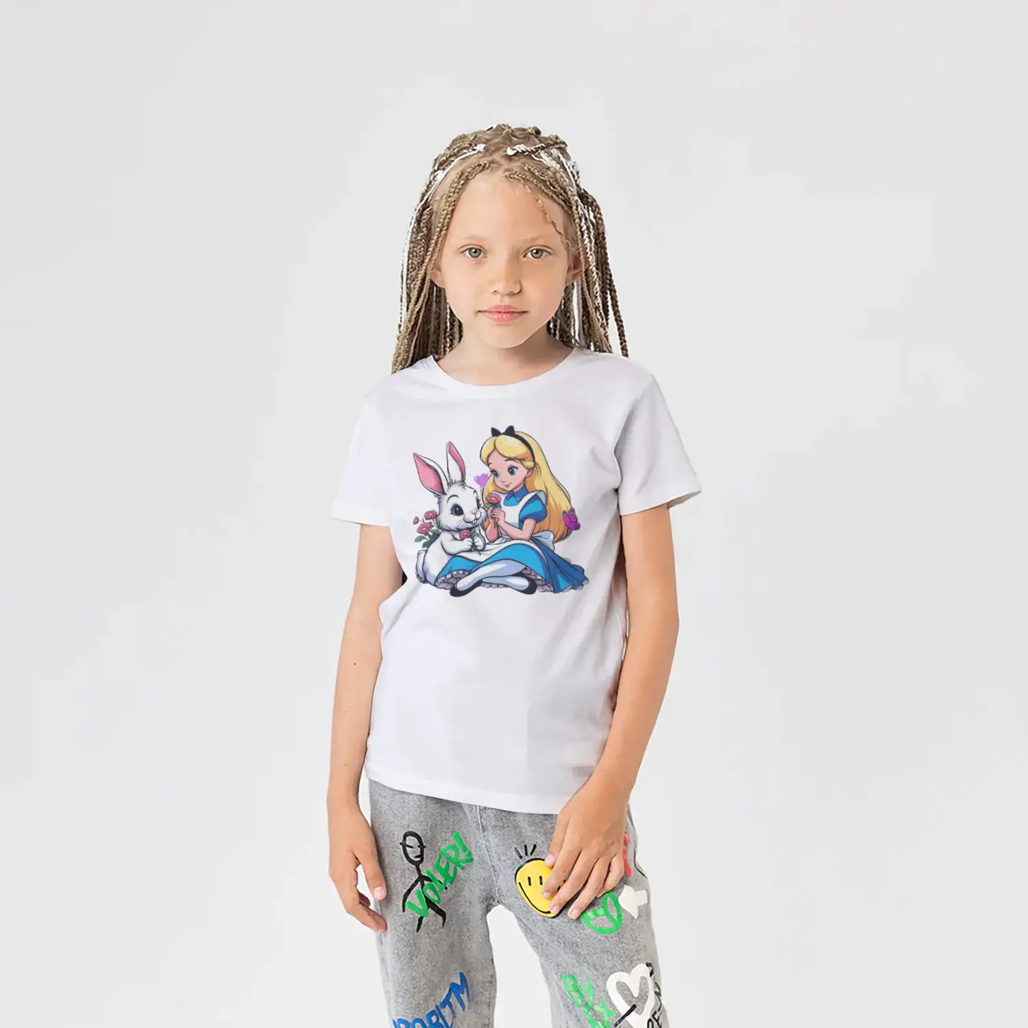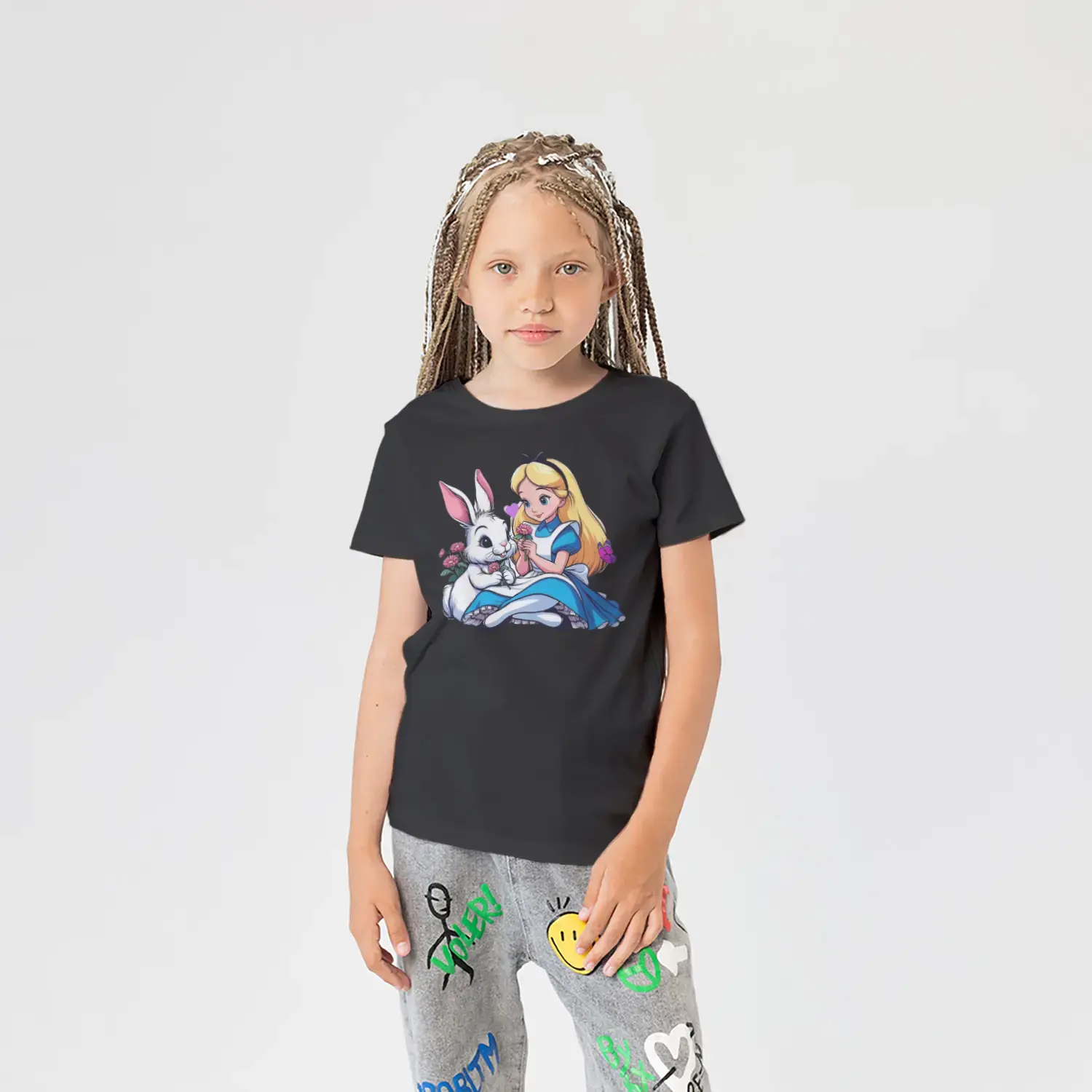 Mavi Elbiseli Sarışın Kız ve Beyaz Tavşan Baskılı Kız Çocuk Tişörtü
