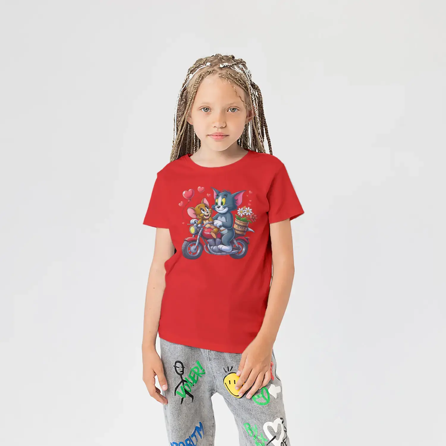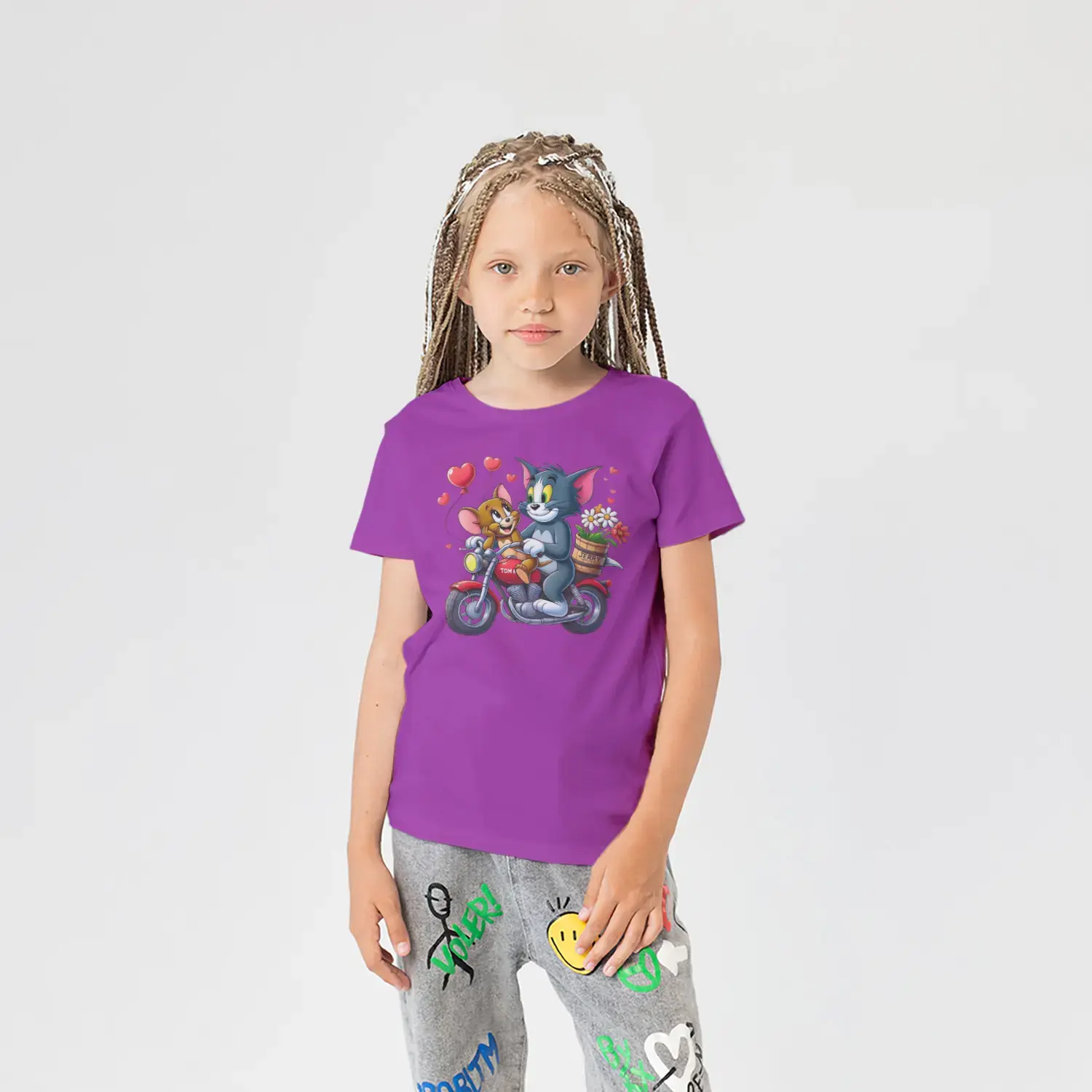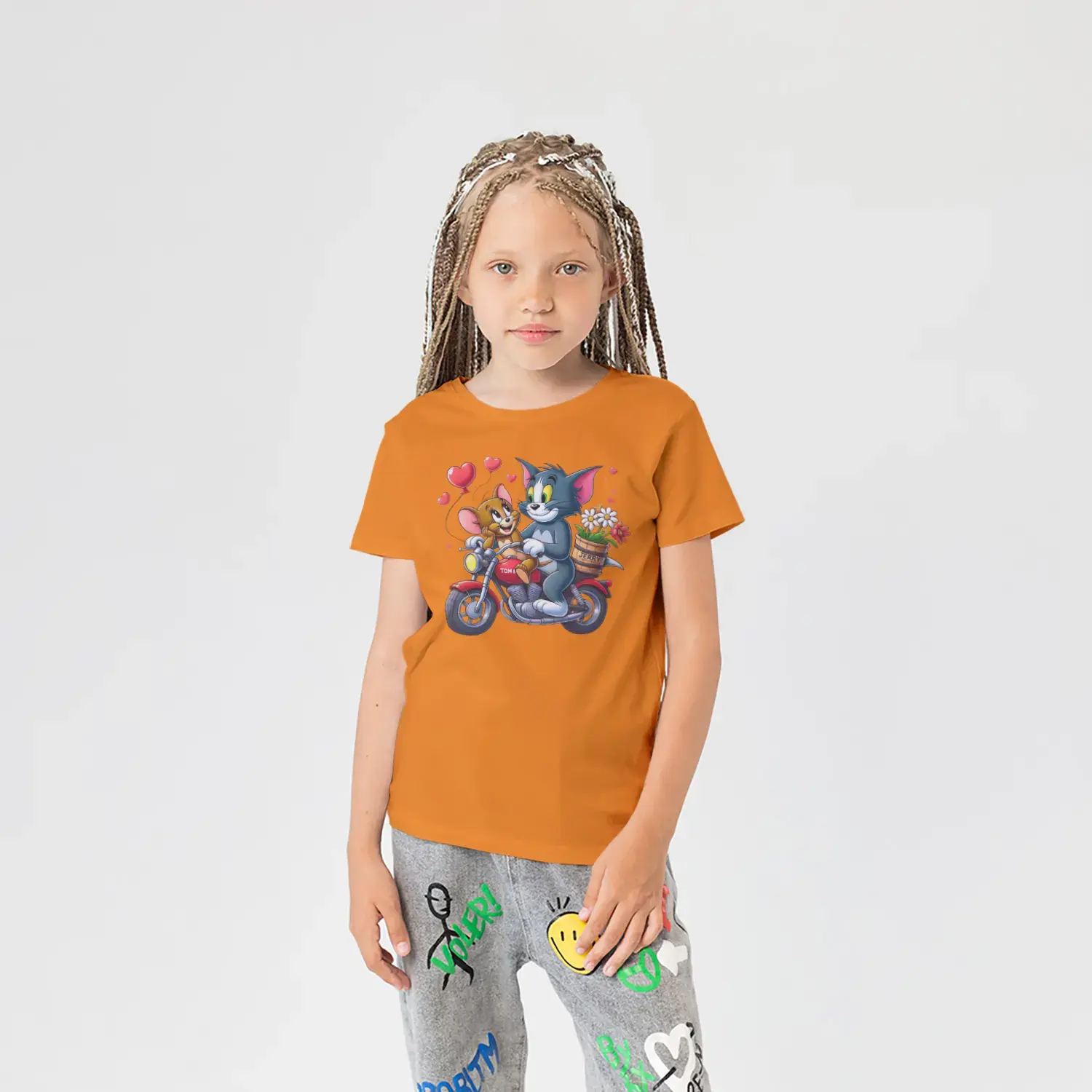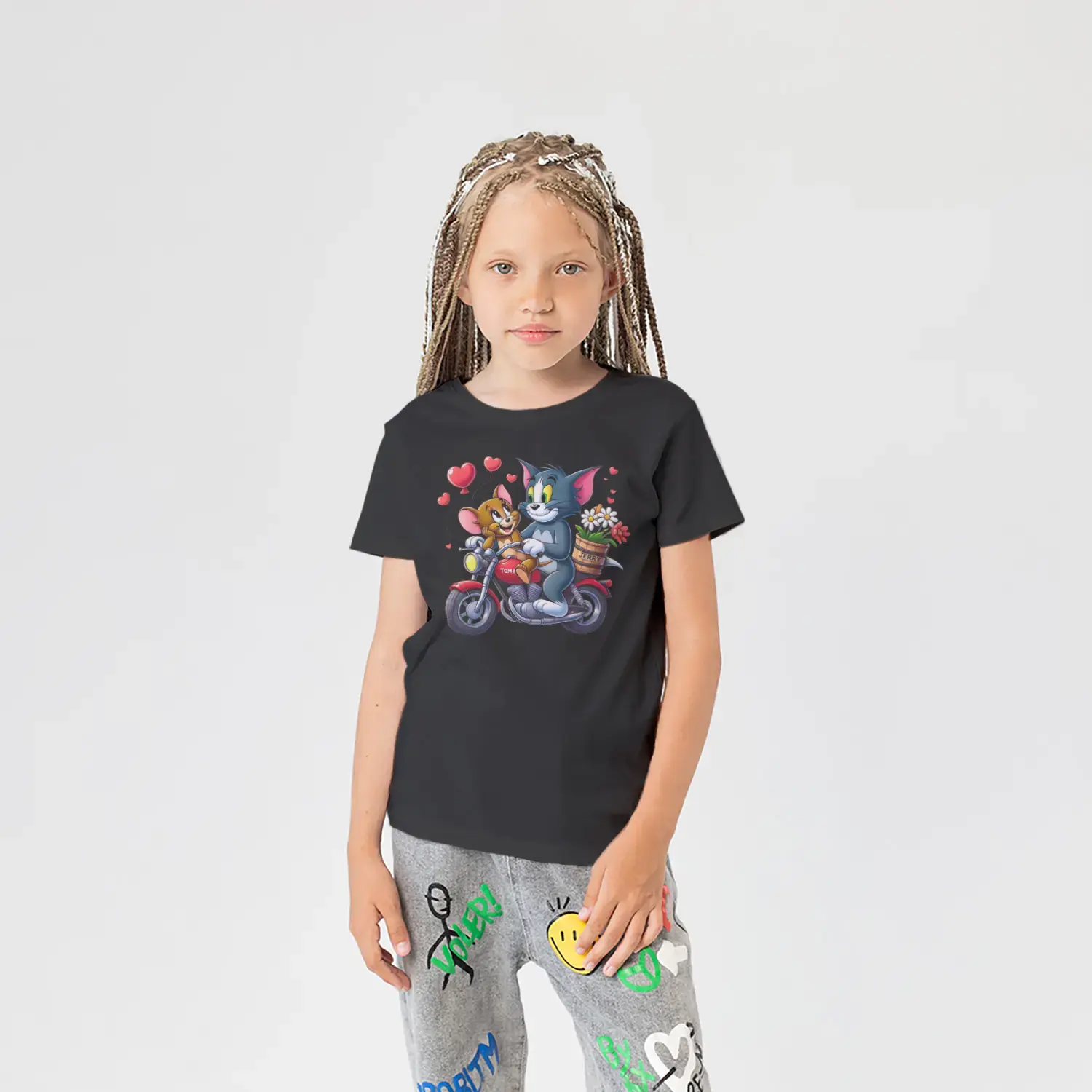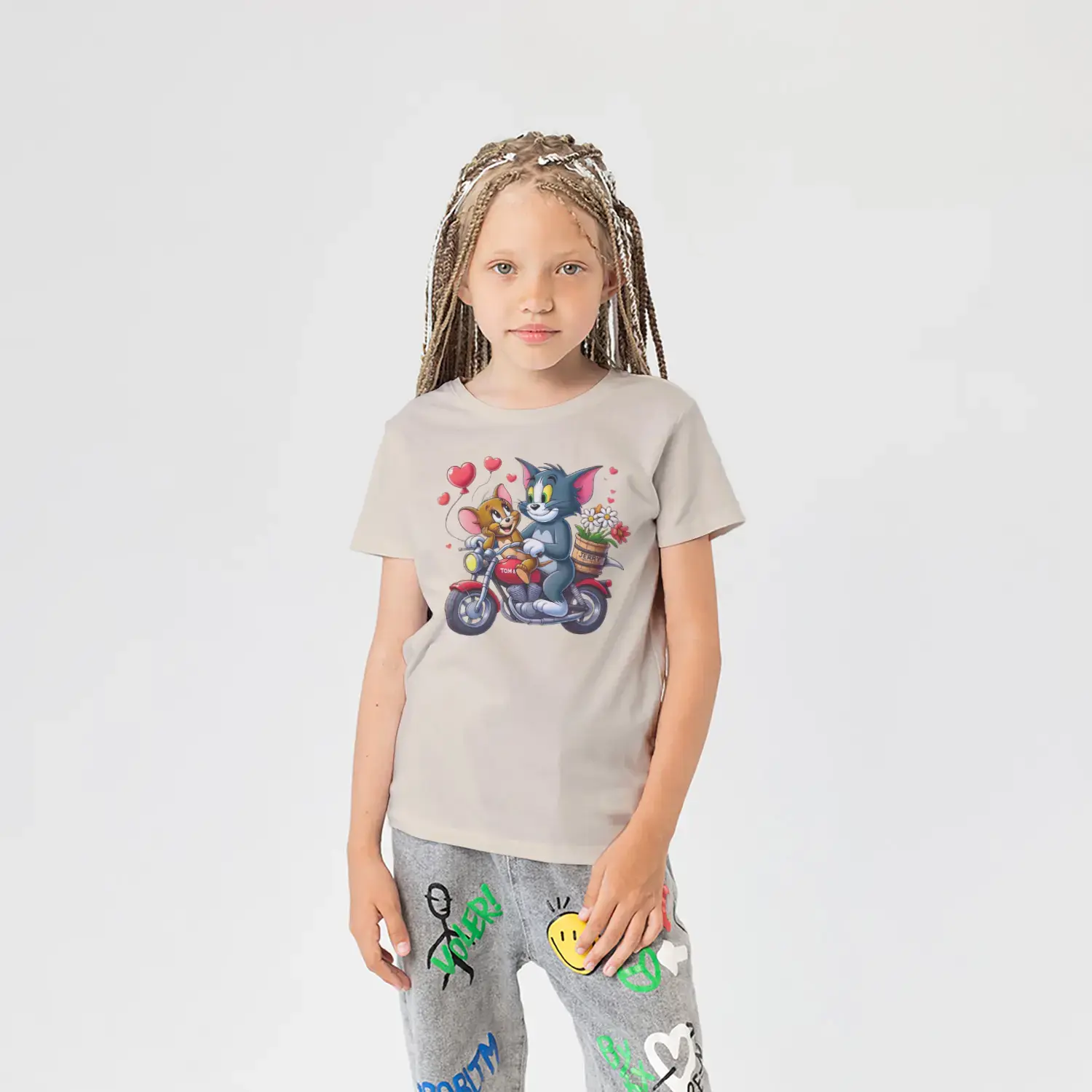Motosikletli Kedi ve Fare Arkadaşlar Baskılı Kız Çocuk Tişörtü