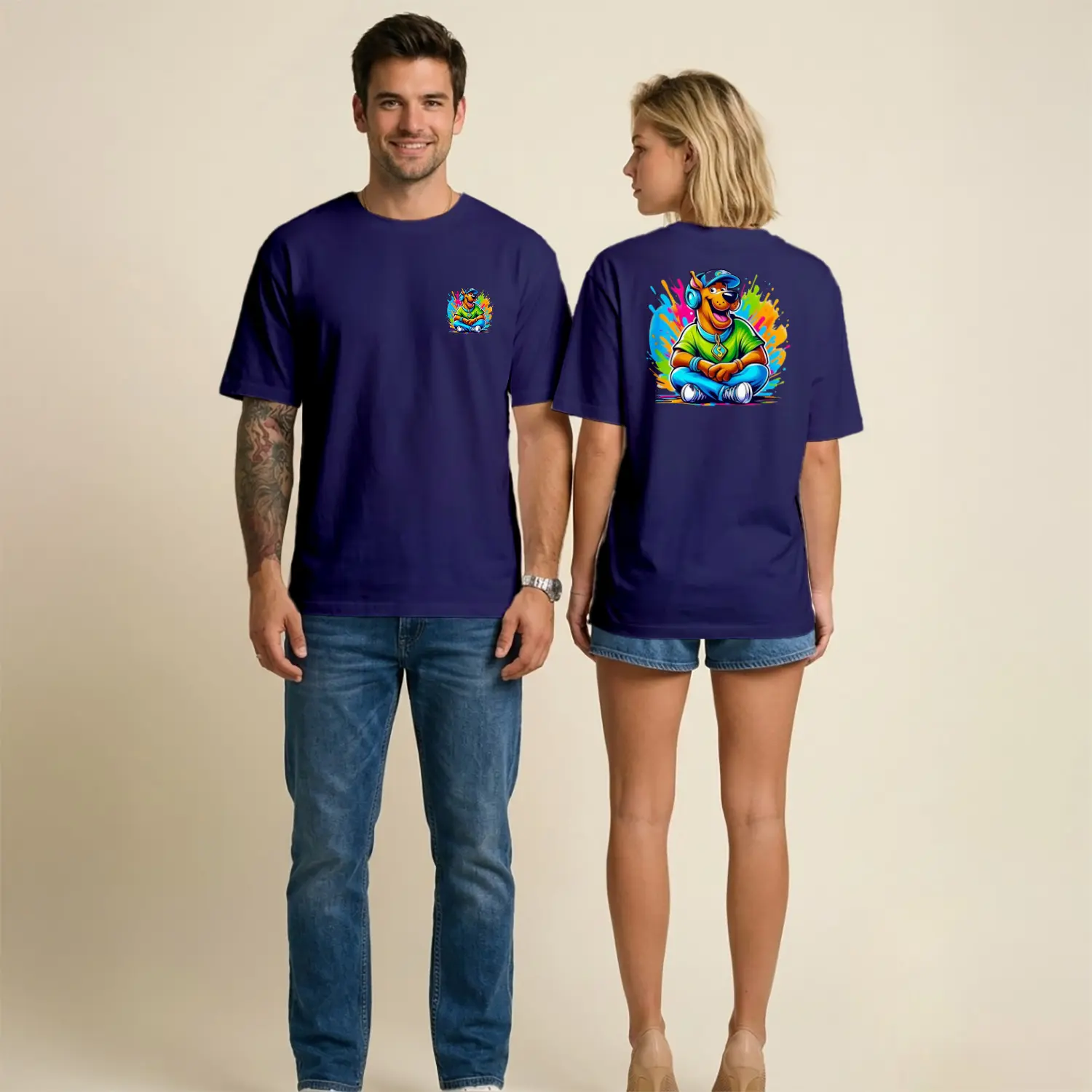 Muzisyen Kopek Karikatur Hip Hop Figürlü On Arka Baskılı Unisex Tişörtü