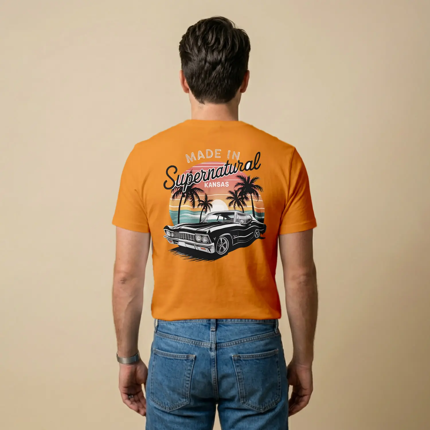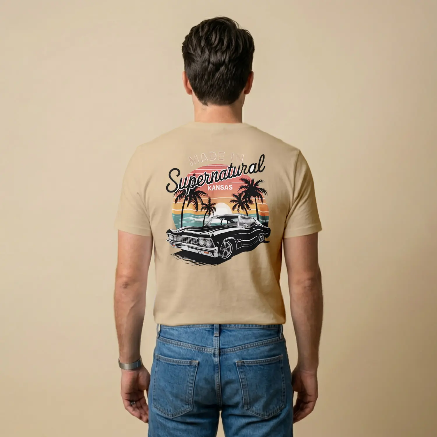Palmiyeli Retro Siyah Araba Baskılı Erkek Tişörtü