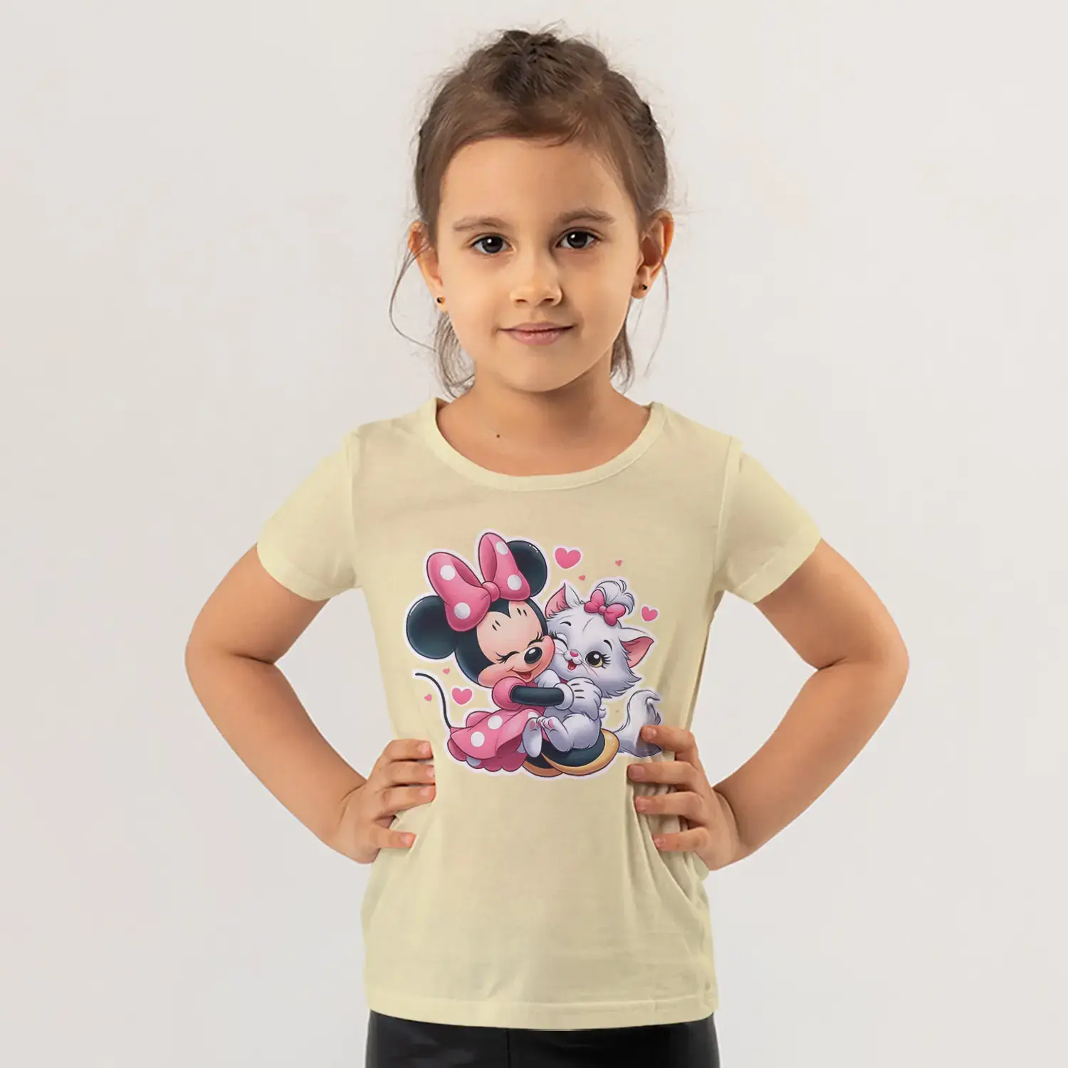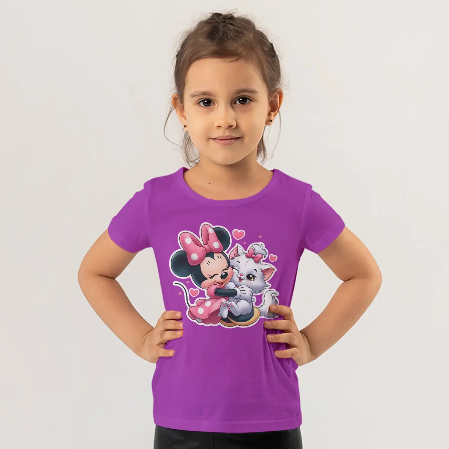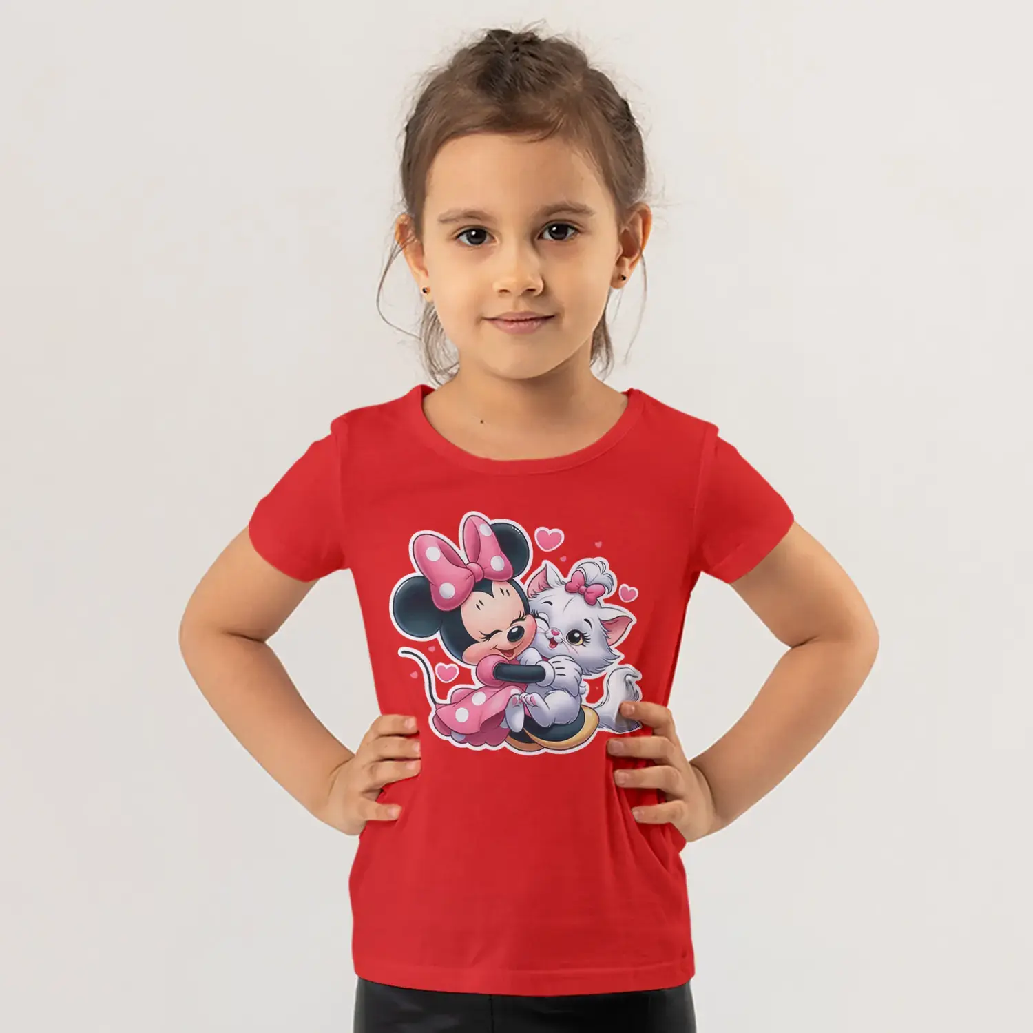 Pembe Fiyonklu Fare Kız ve Beyaz Kedi Arkadaşlık Sarılma Baskılı Kız Çocuk Tişörtü için 10 değerlendirme