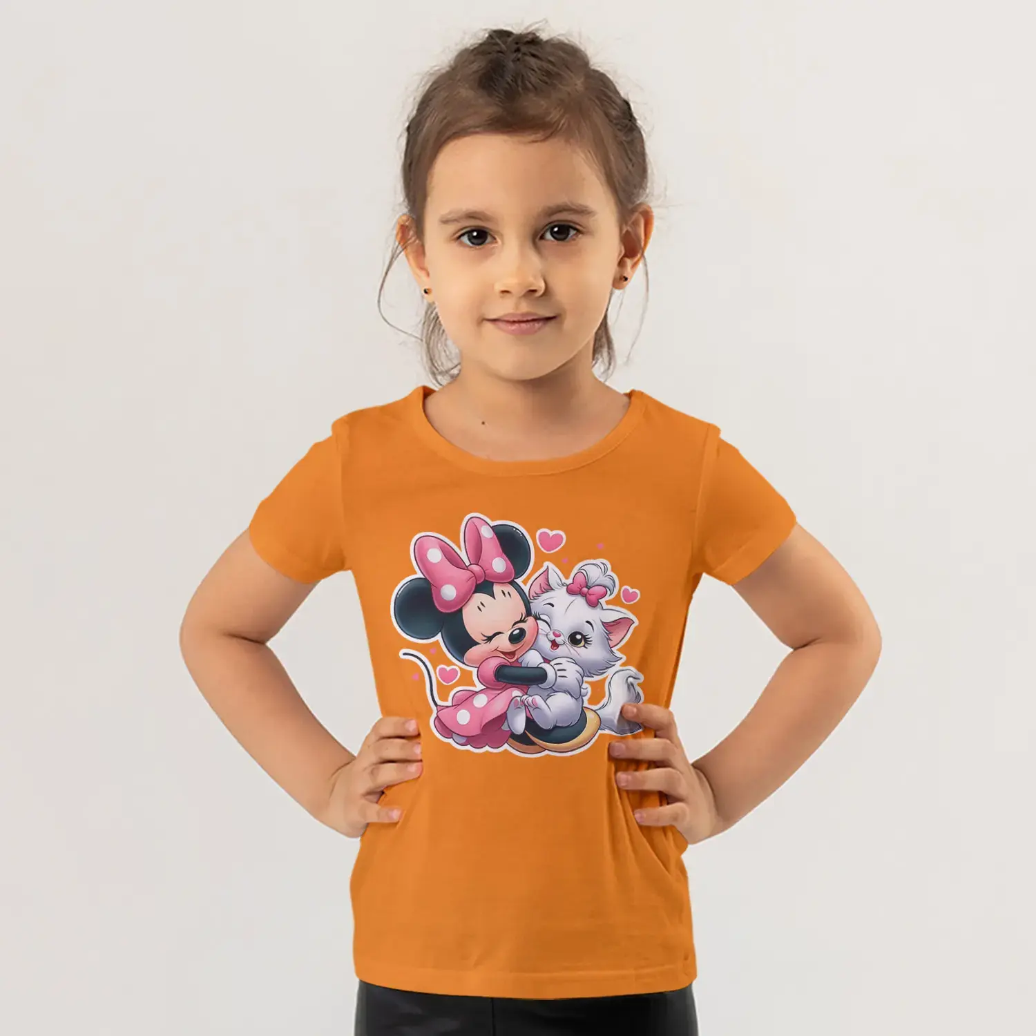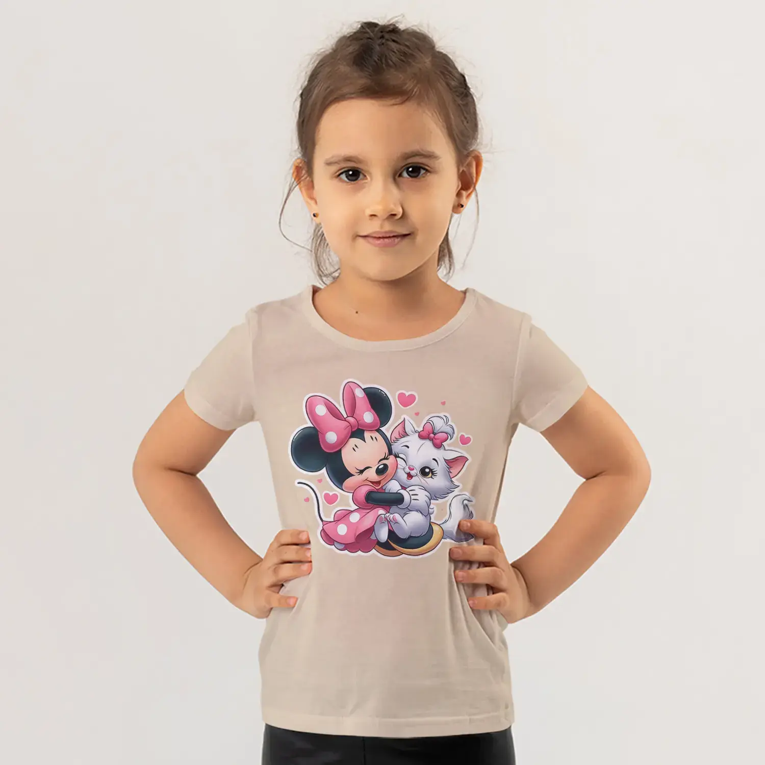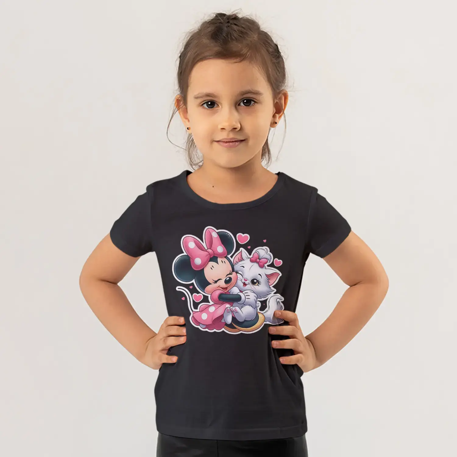 Pembe Fiyonklu Fare Kız ve Beyaz Kedi Arkadaşlık Sarılma Baskılı Kız Çocuk Tişörtü için 10 değerlendirme