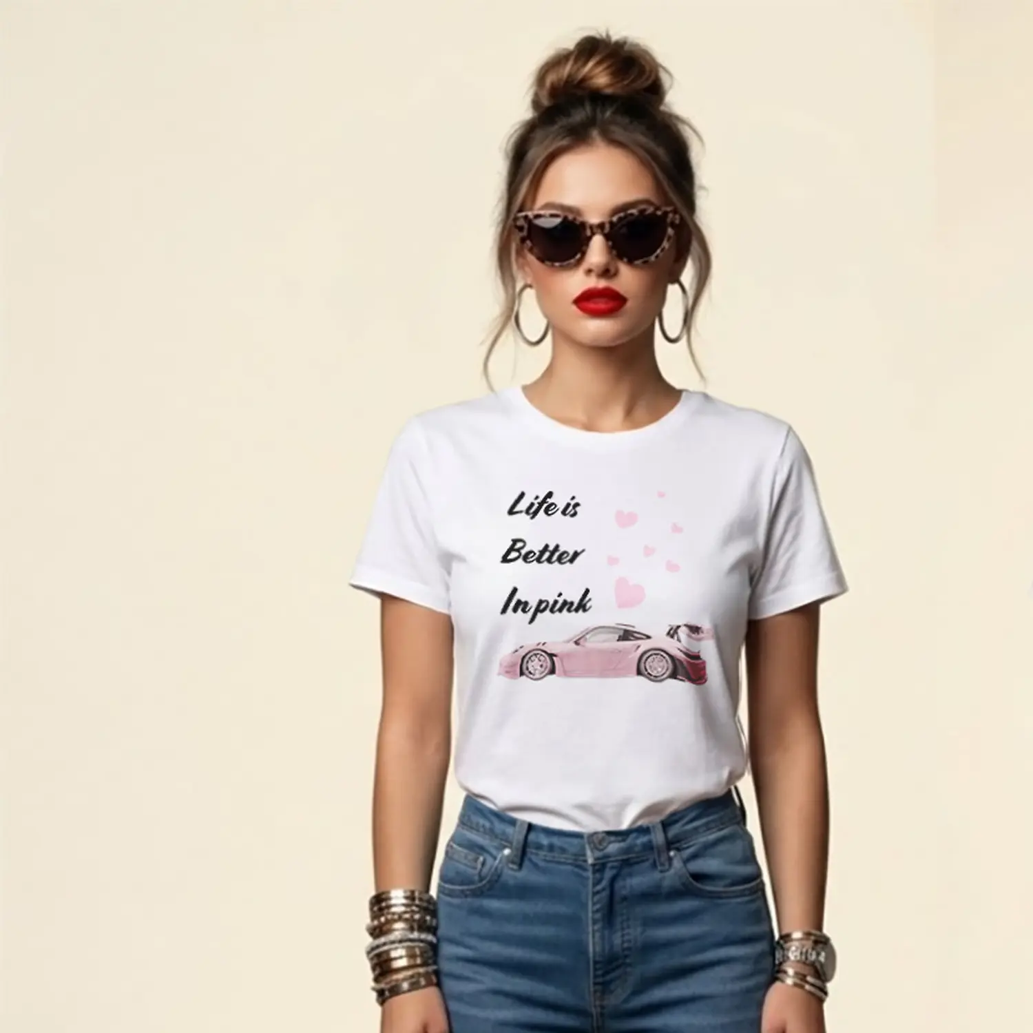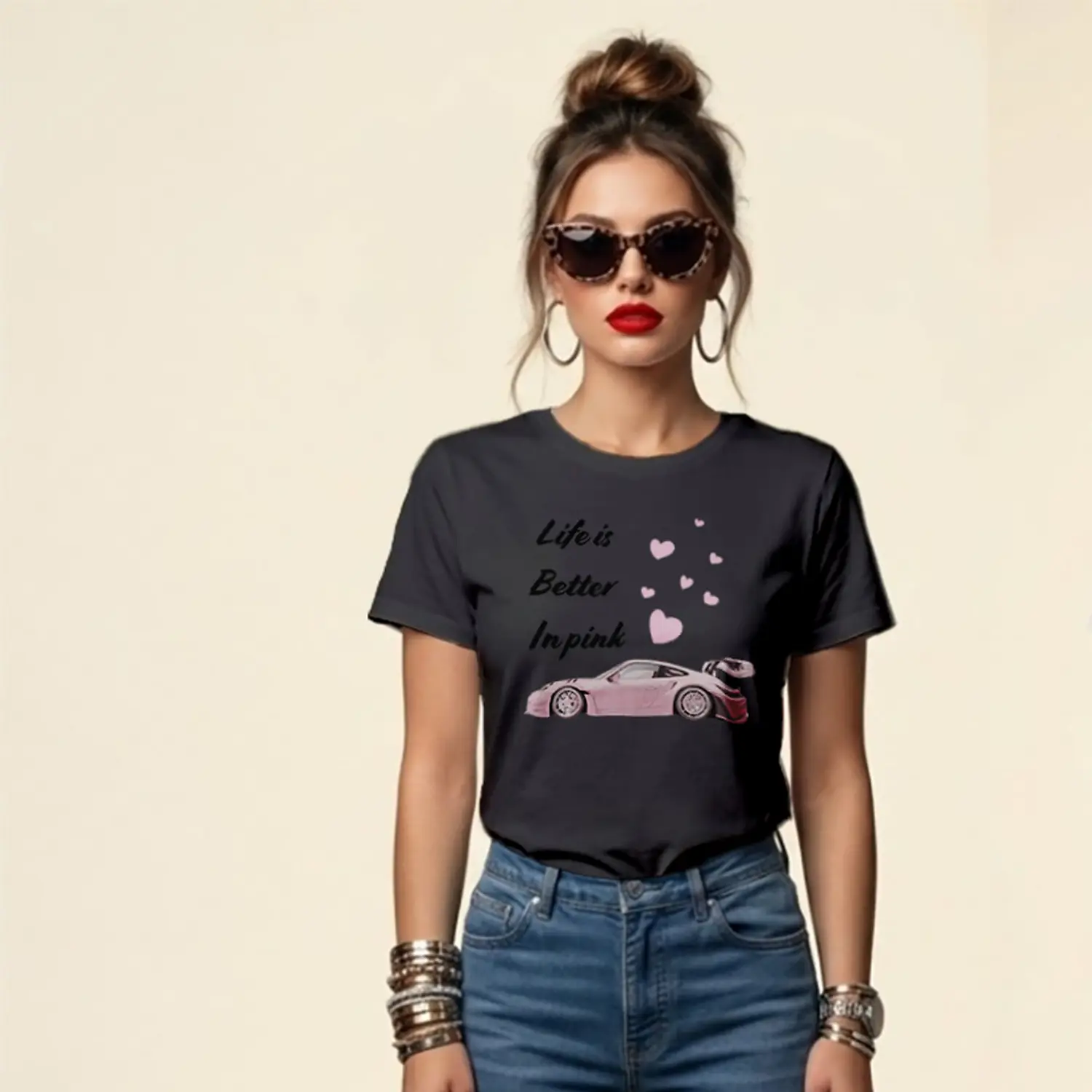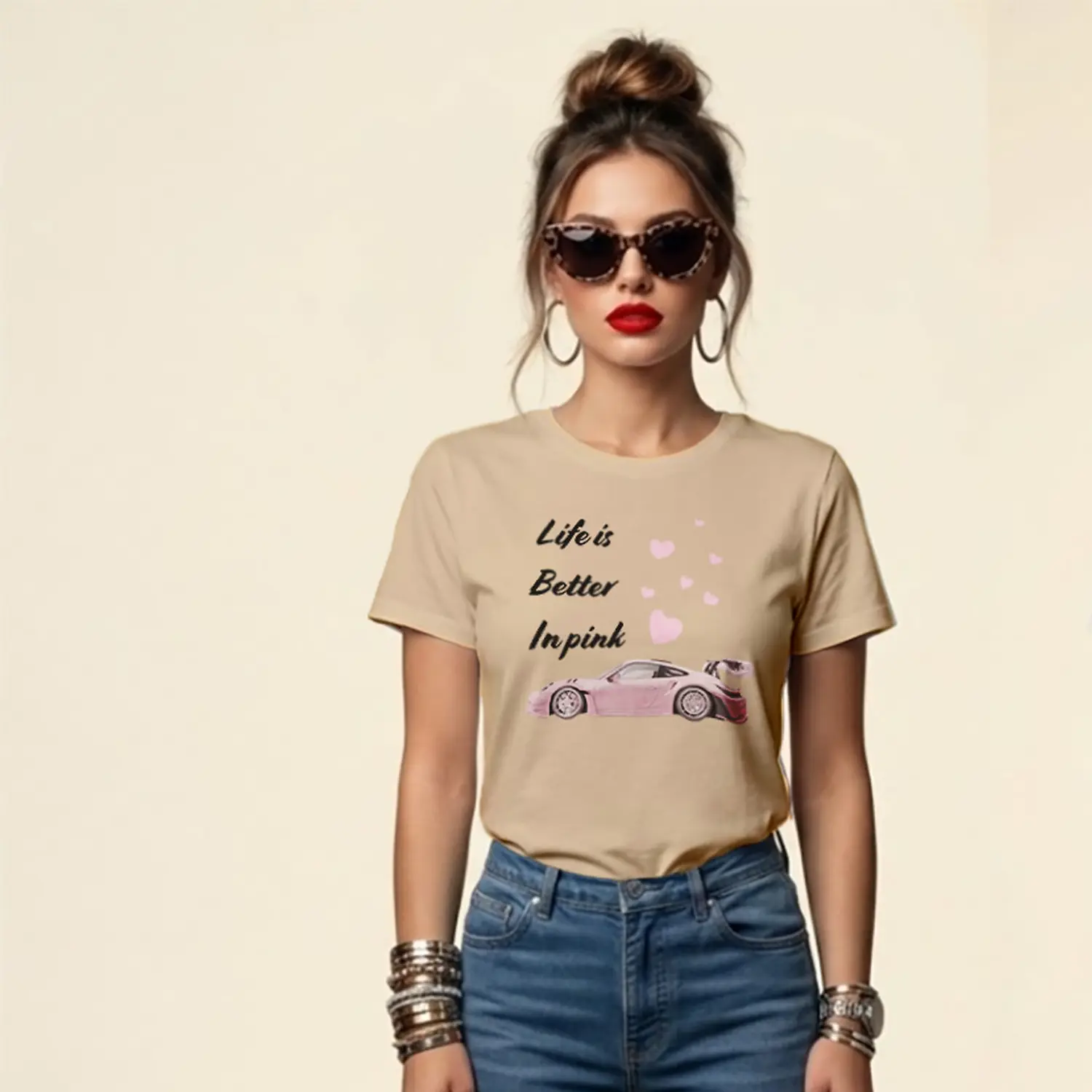 Pembe Spor Araba ve Kalpler Baskılı Kadın Tişört
