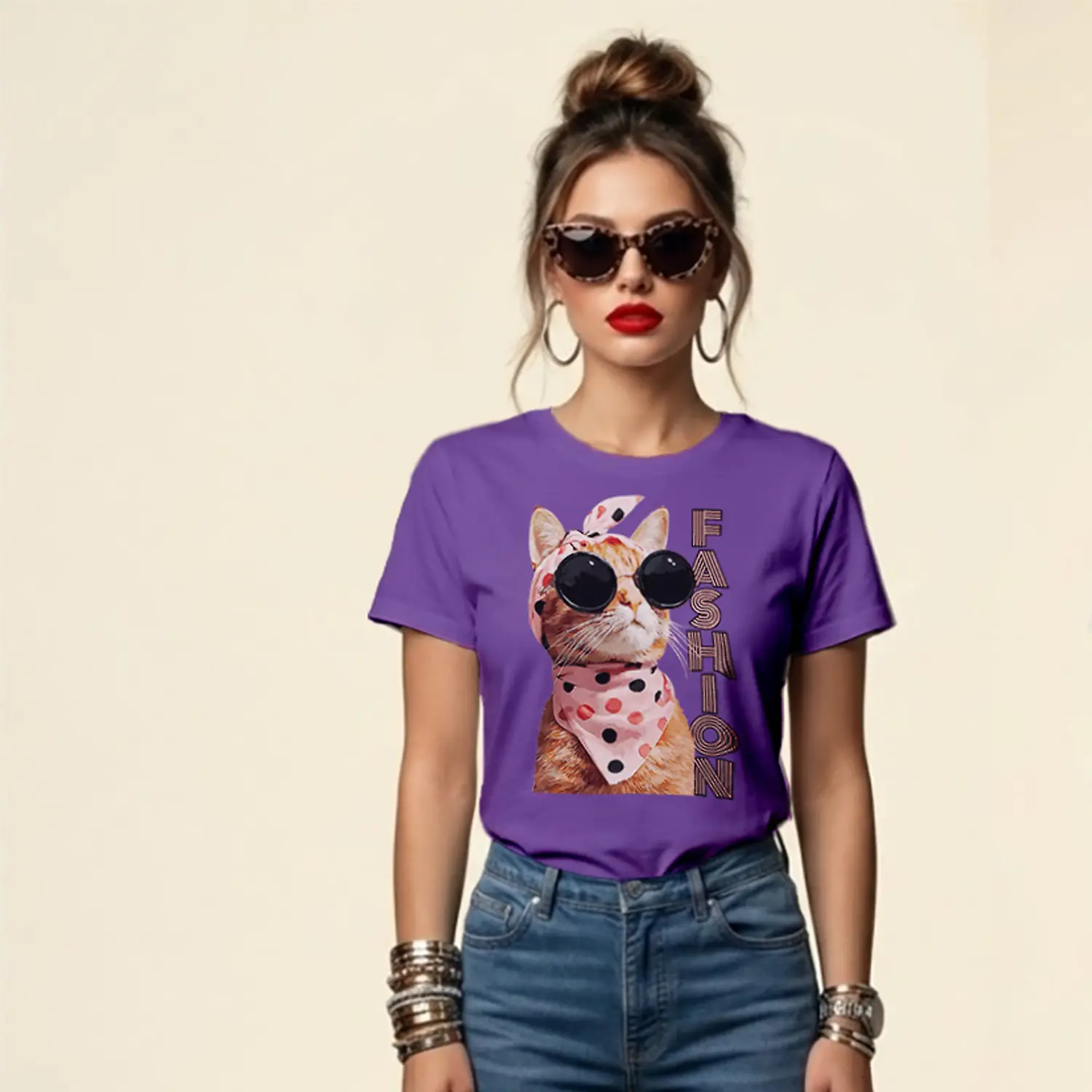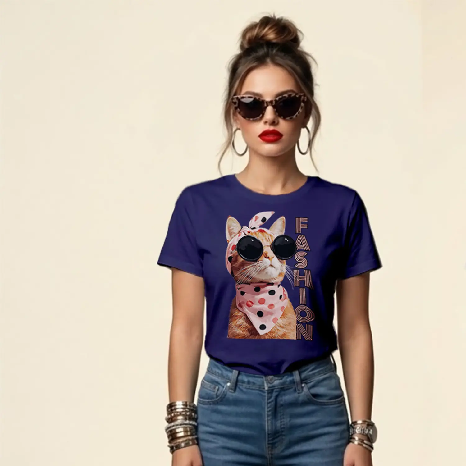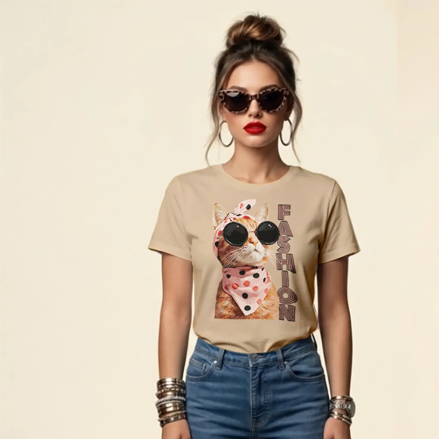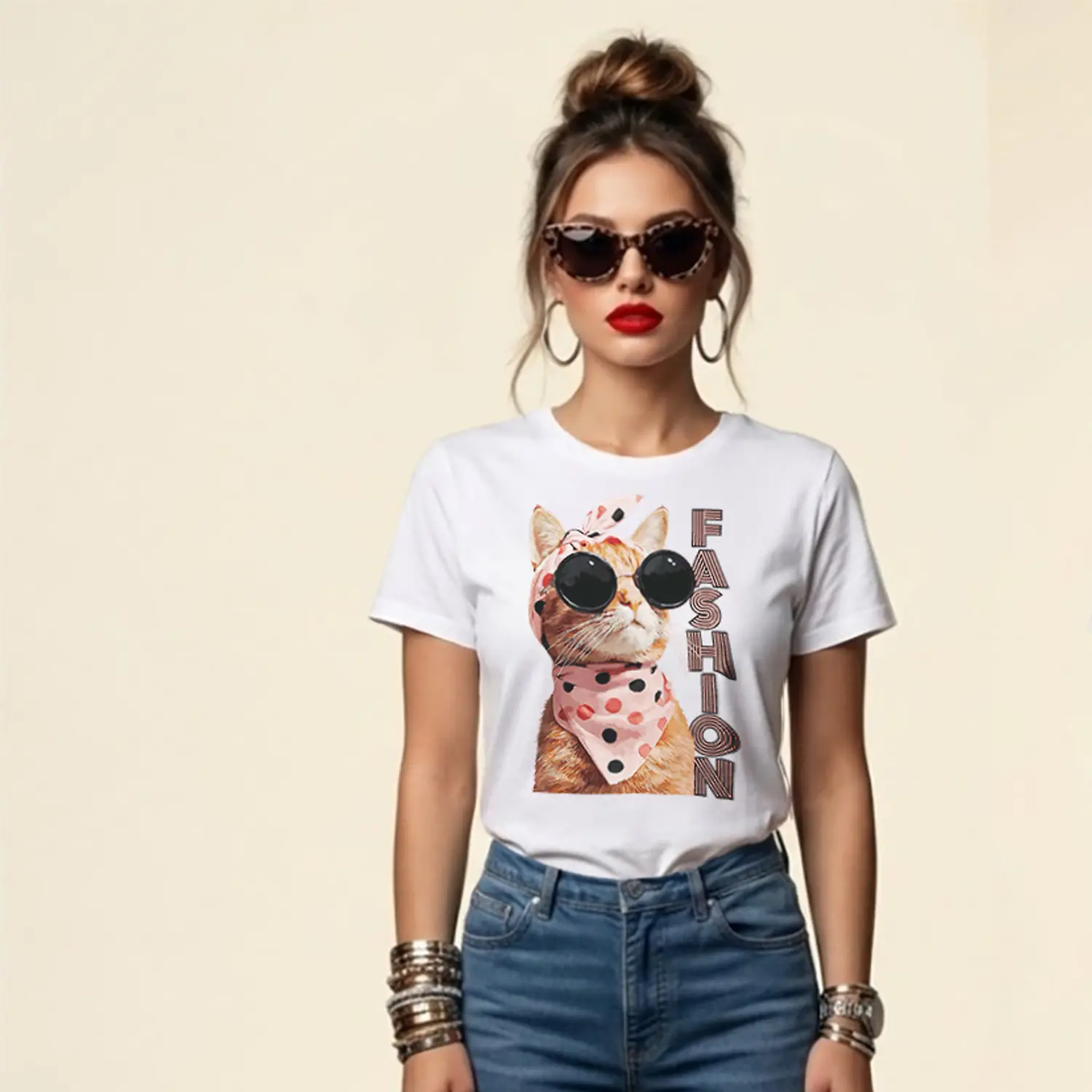 Puantiye Desenli Kedi Baskılı Kadın Tişört