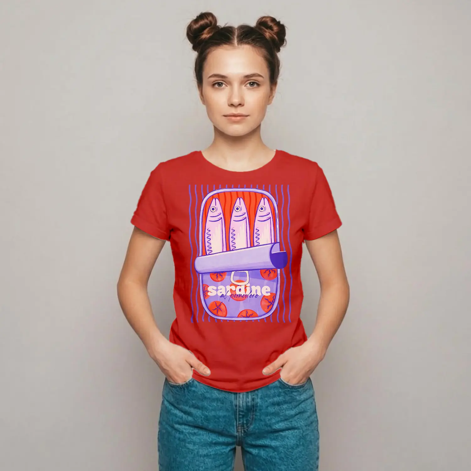 Renkli Balık ve Domates Desenli Baskılı Kadın Tişört