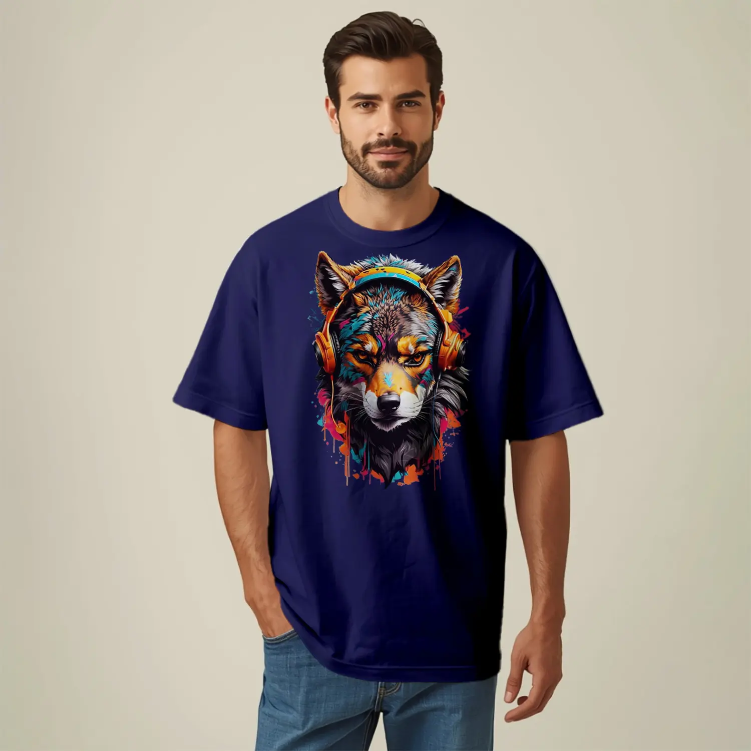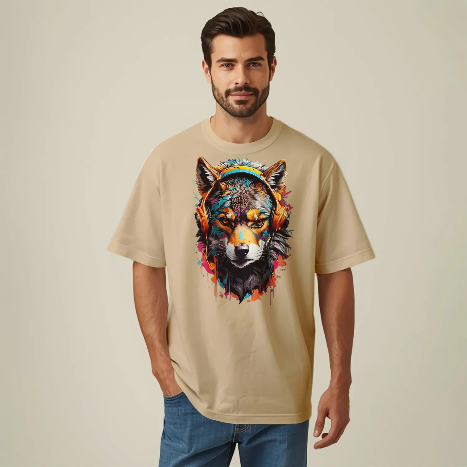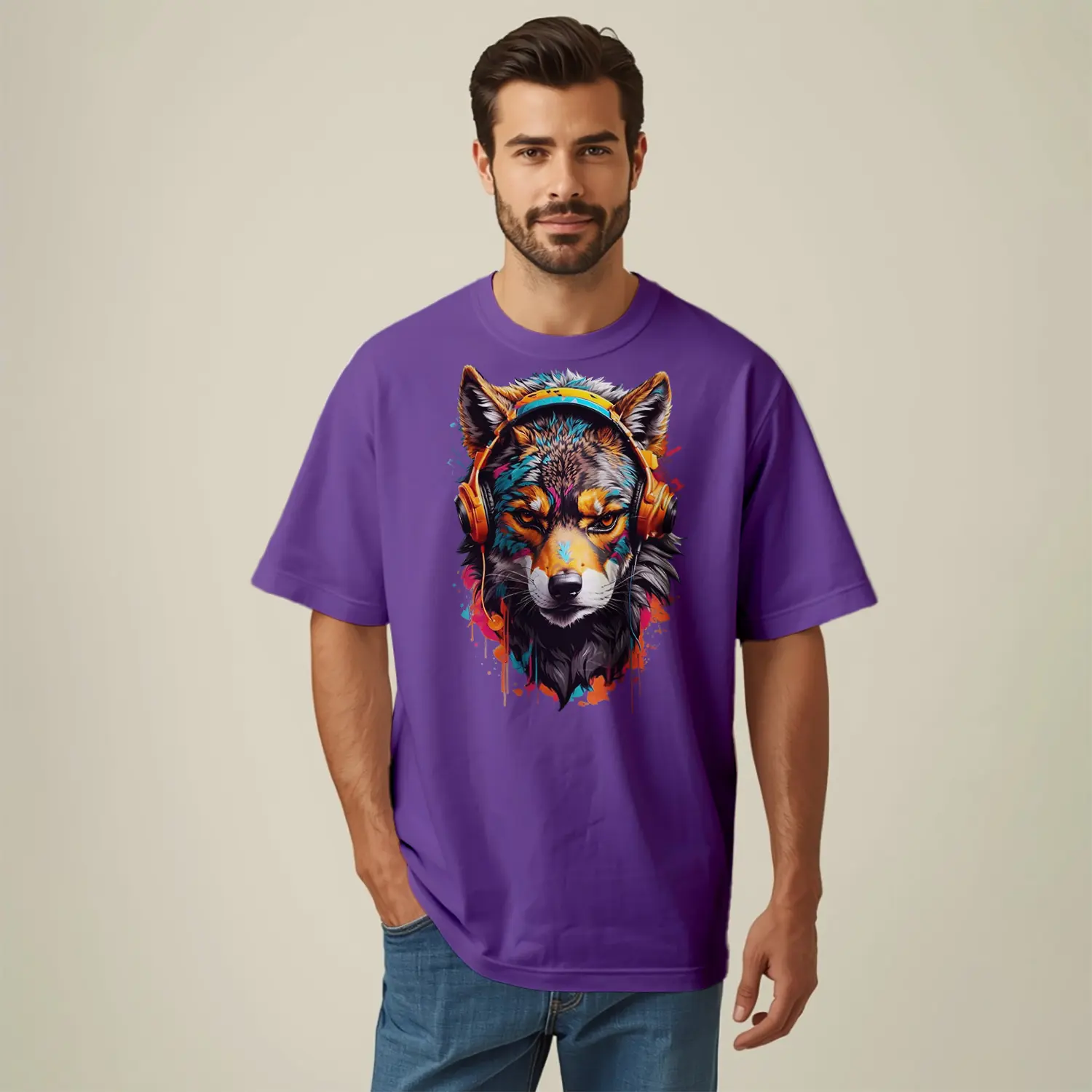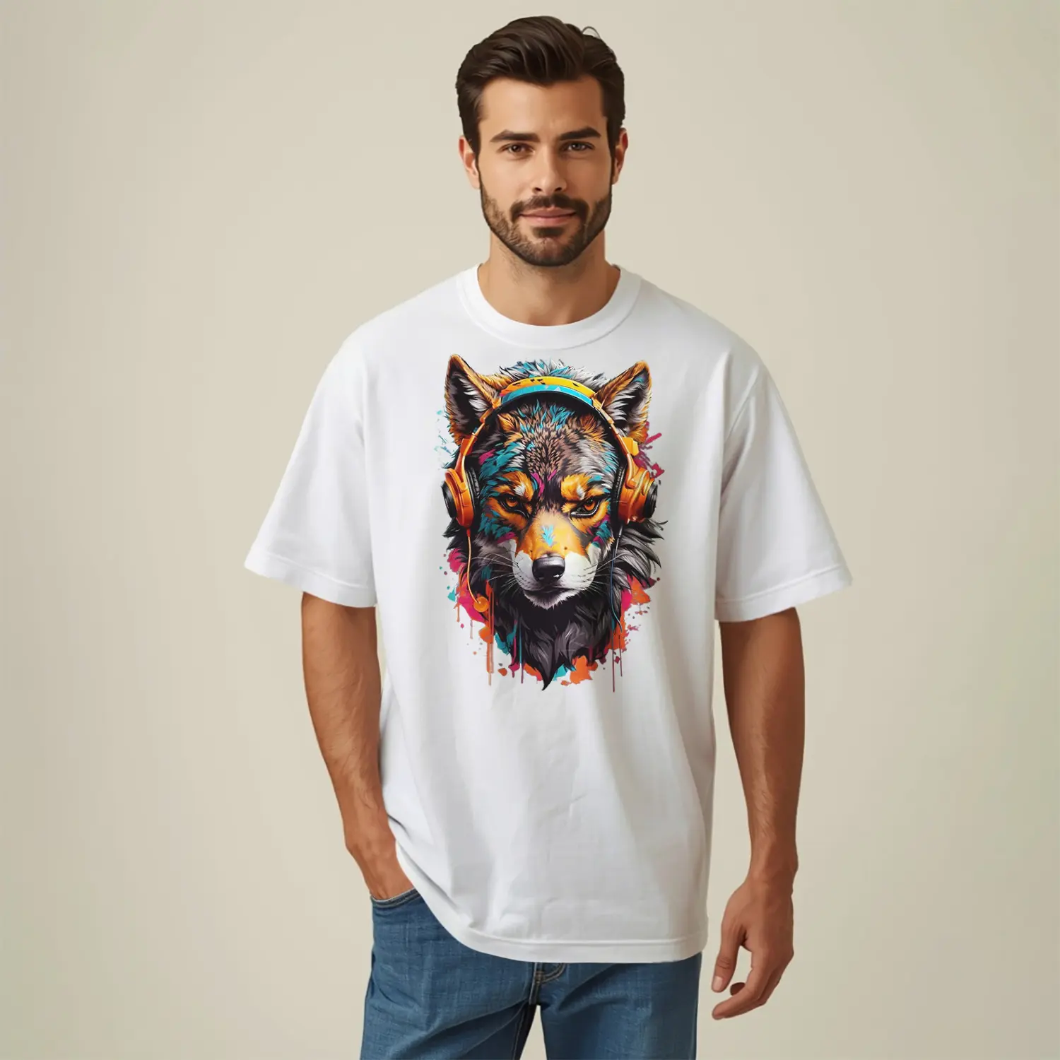 Renkli Kurt ve Kulaklık Tasarımlı Baskılı Erkek Tişört