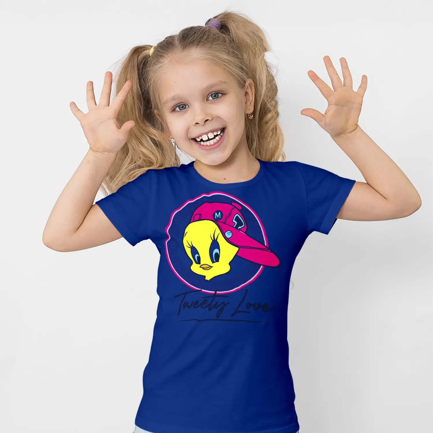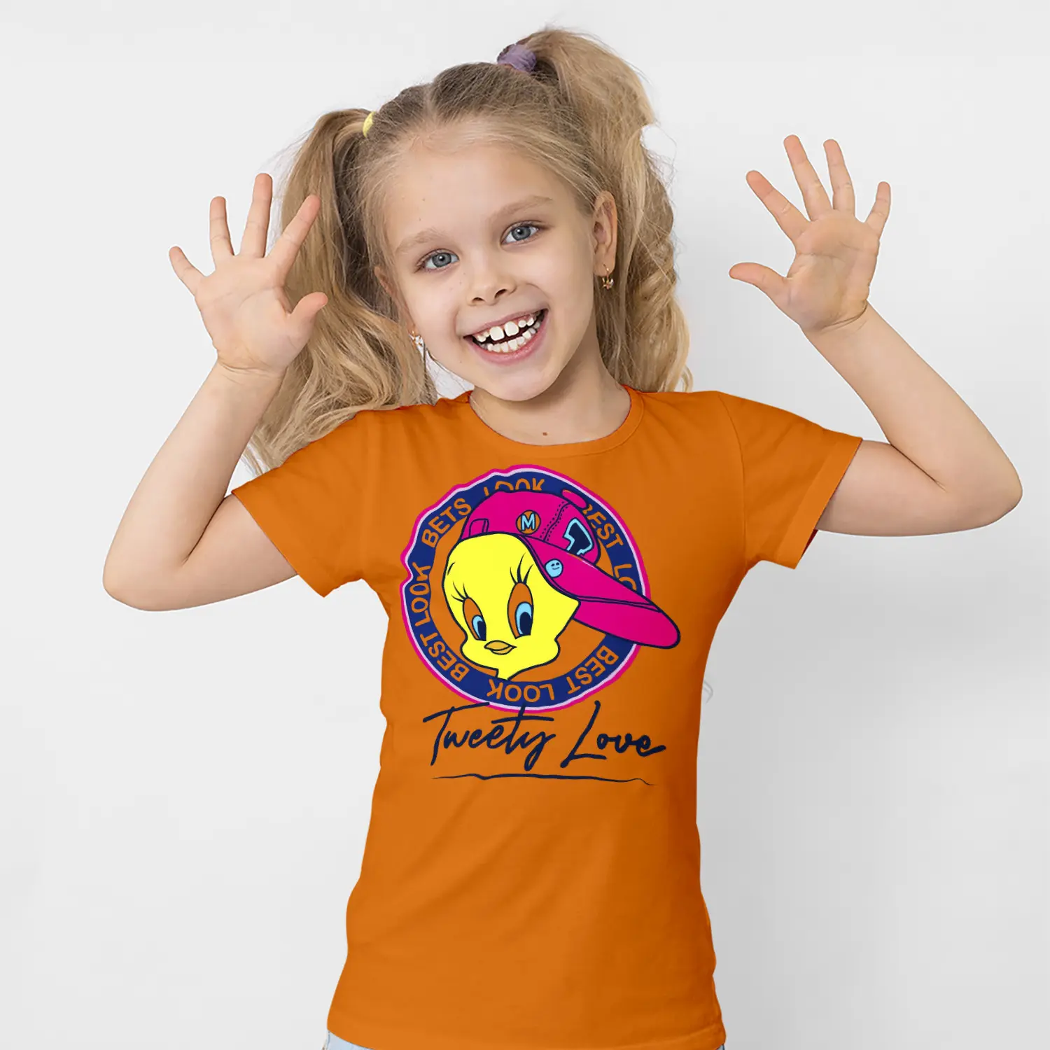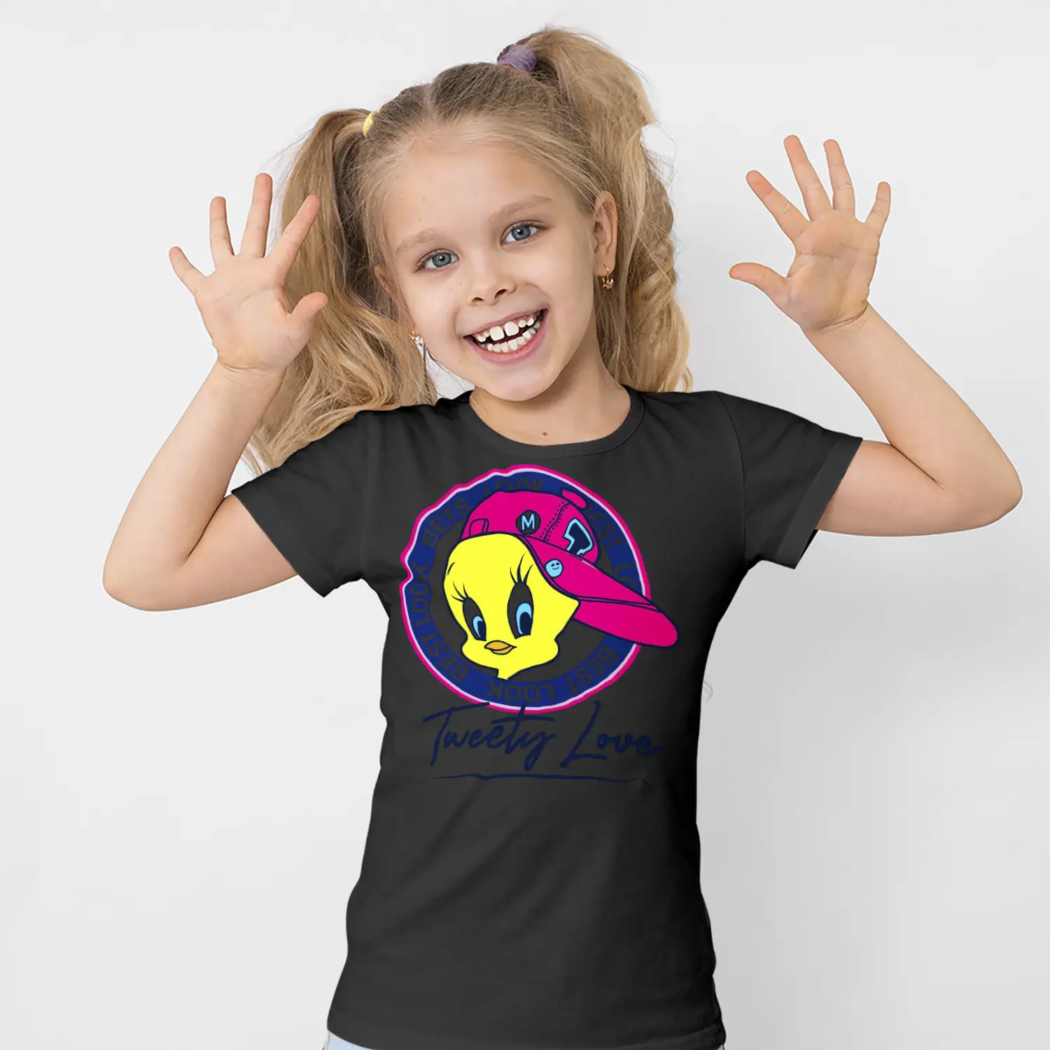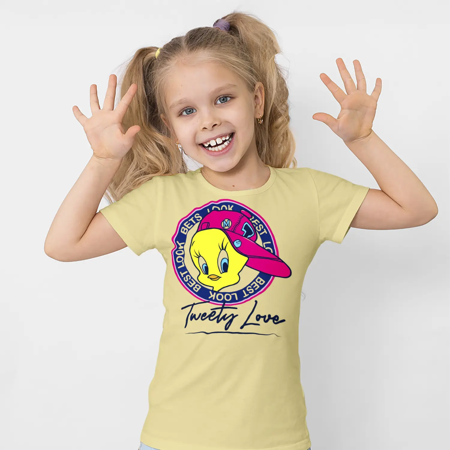 Şapkalı Sarı Kuş Karikatür Tweety Love Yazılı Baskılı Kız Çocuk Tişörtü