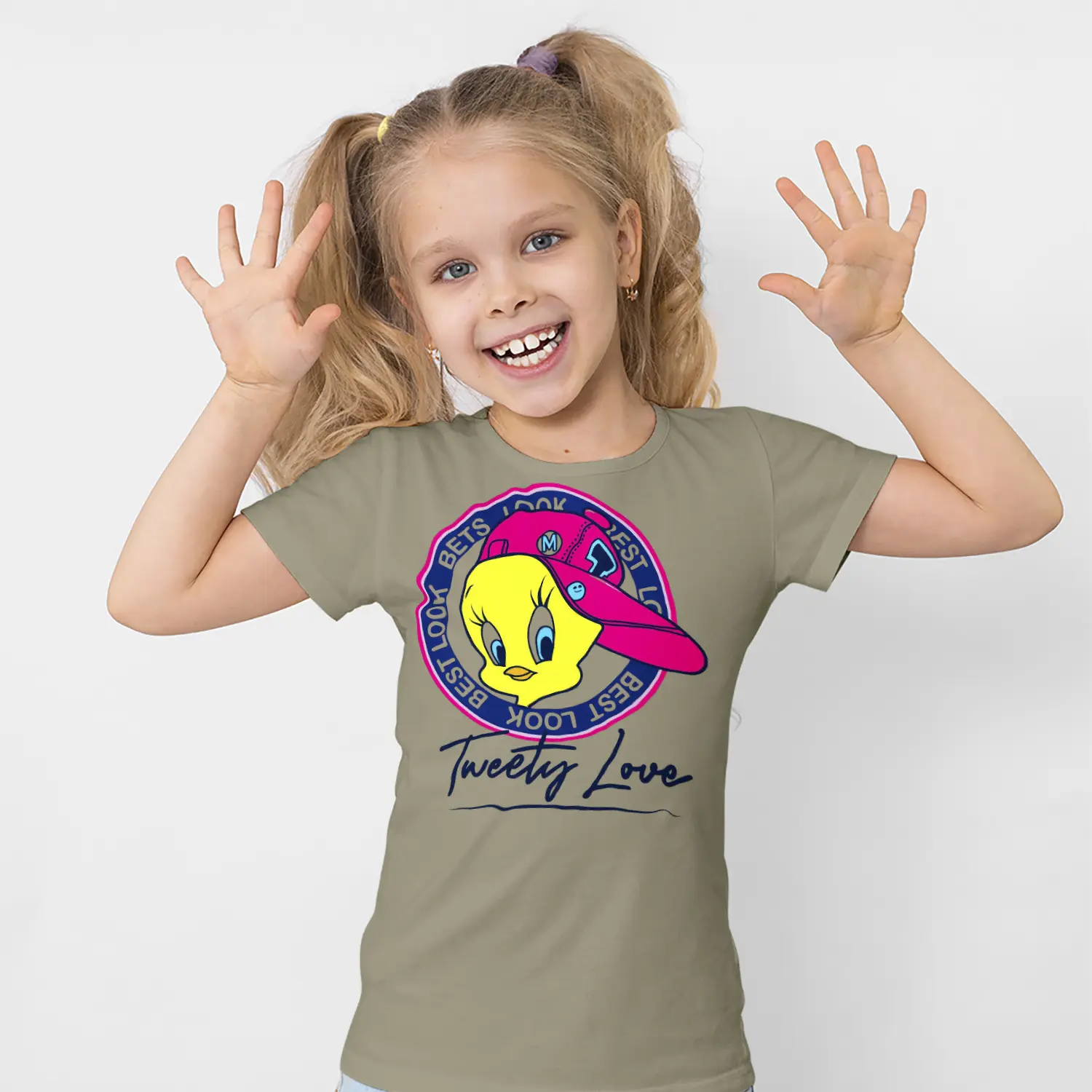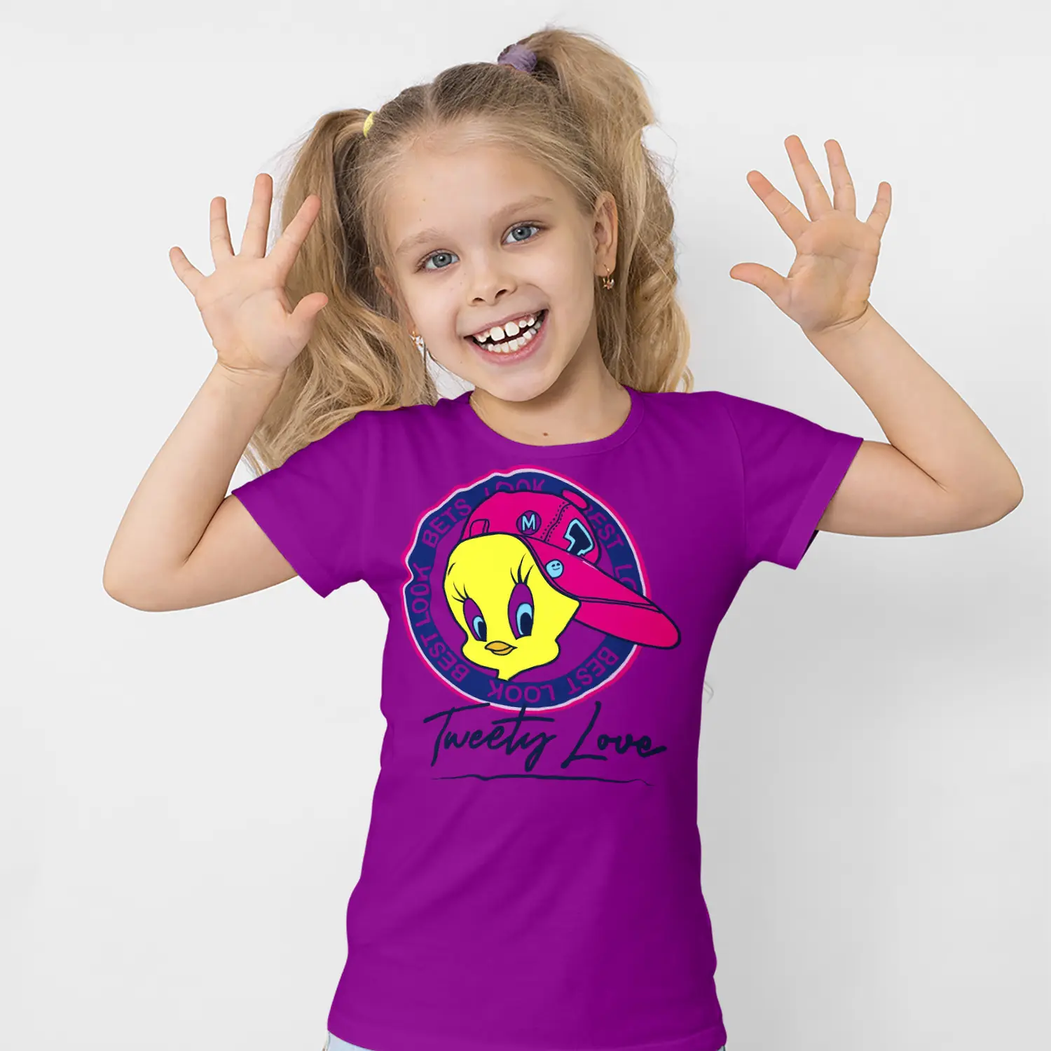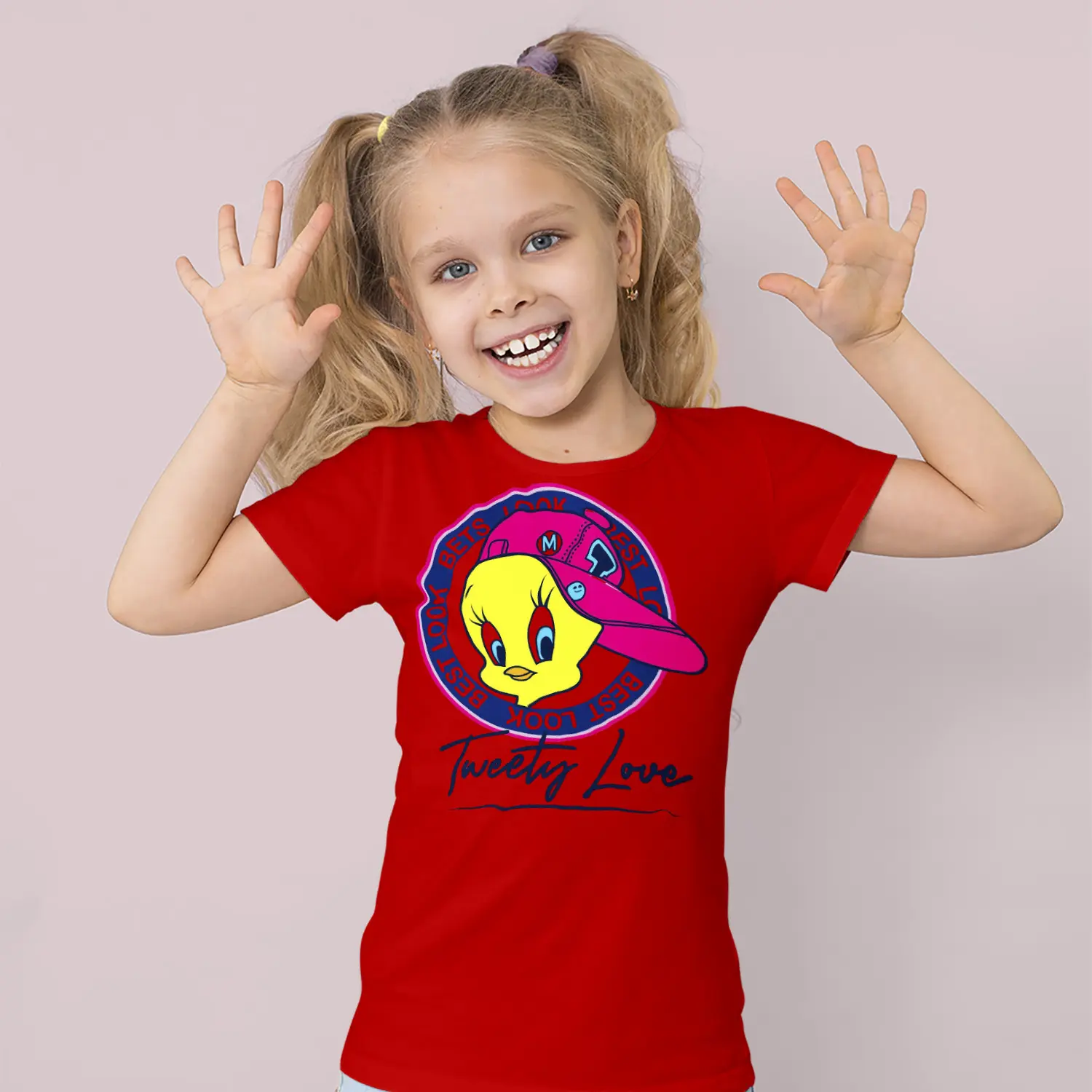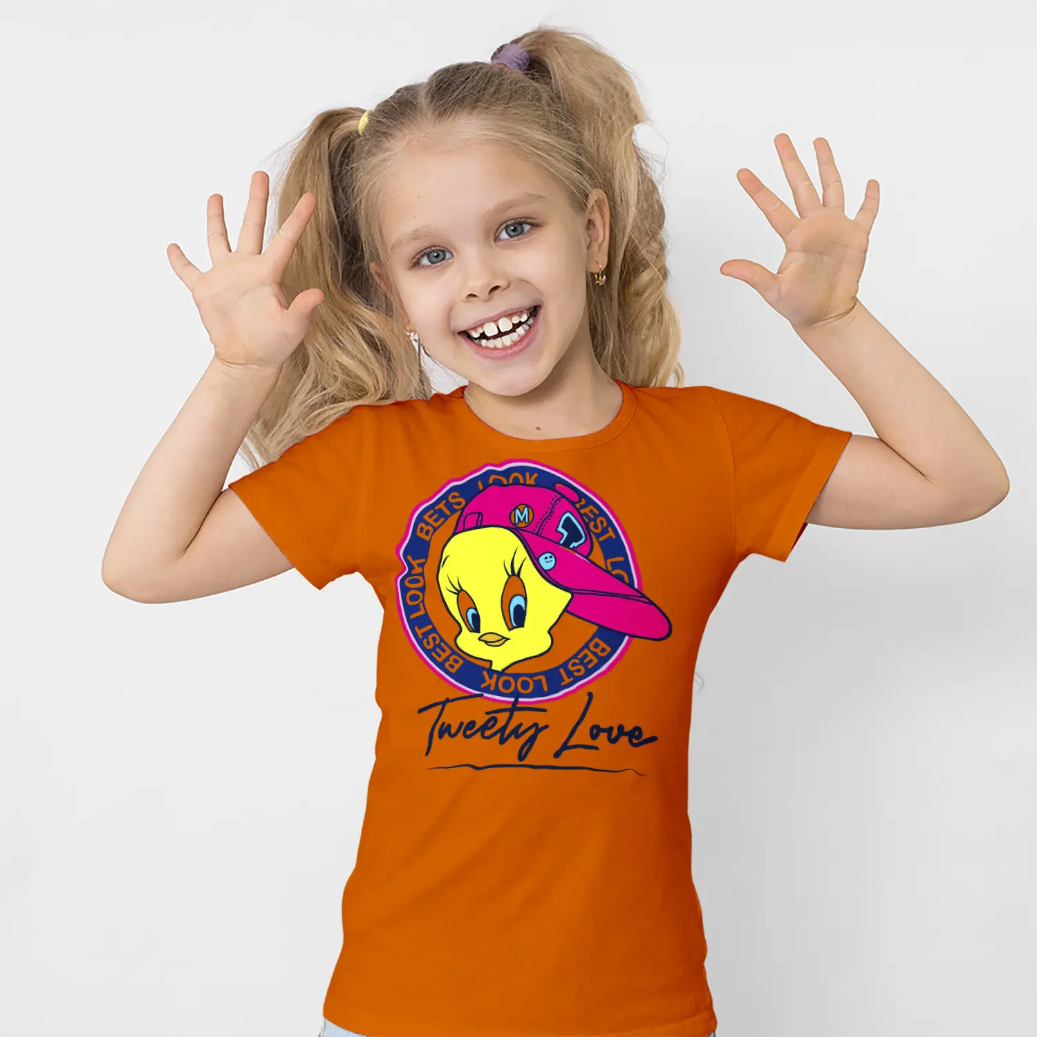 Şapkalı Sarı Kuş Karikatür Tweety Love Yazılı Baskılı Kız Çocuk Tişörtü