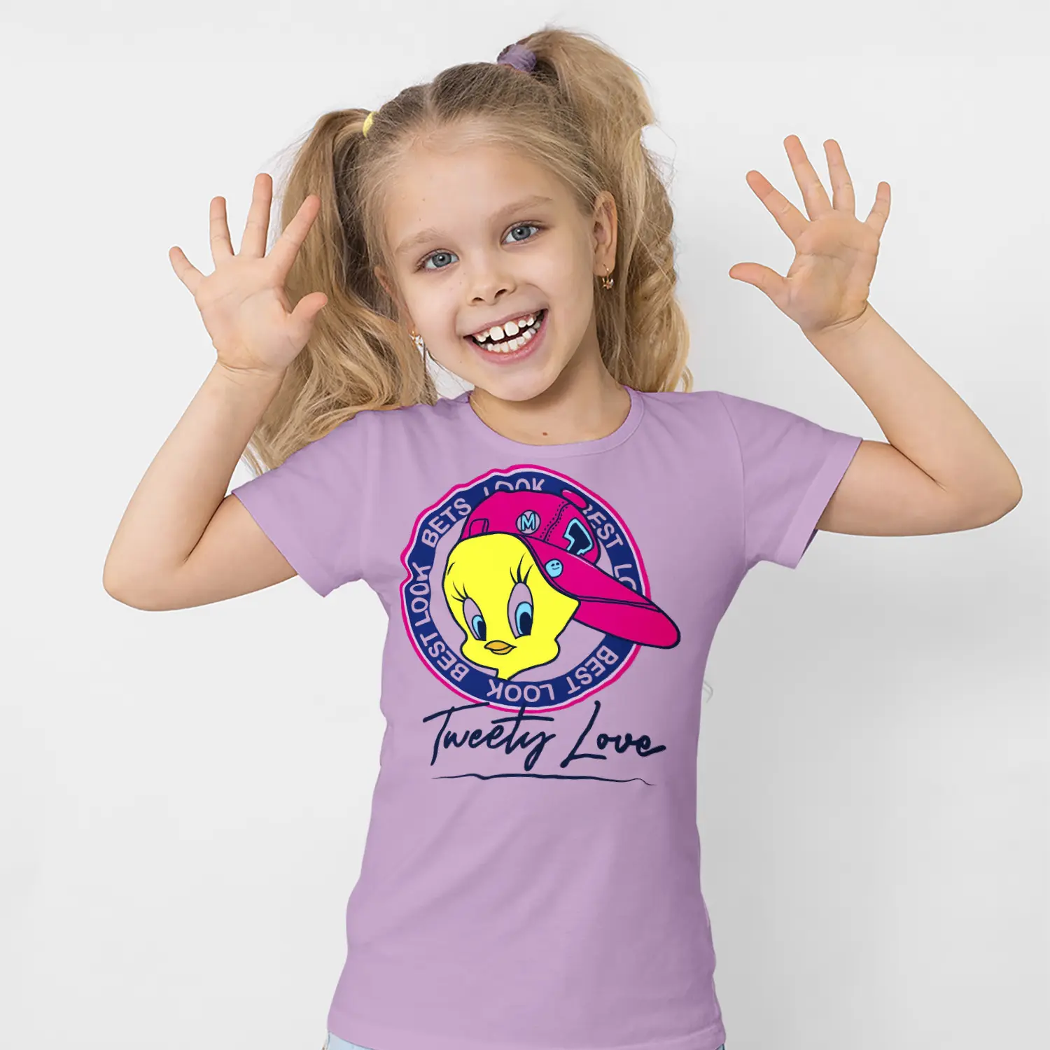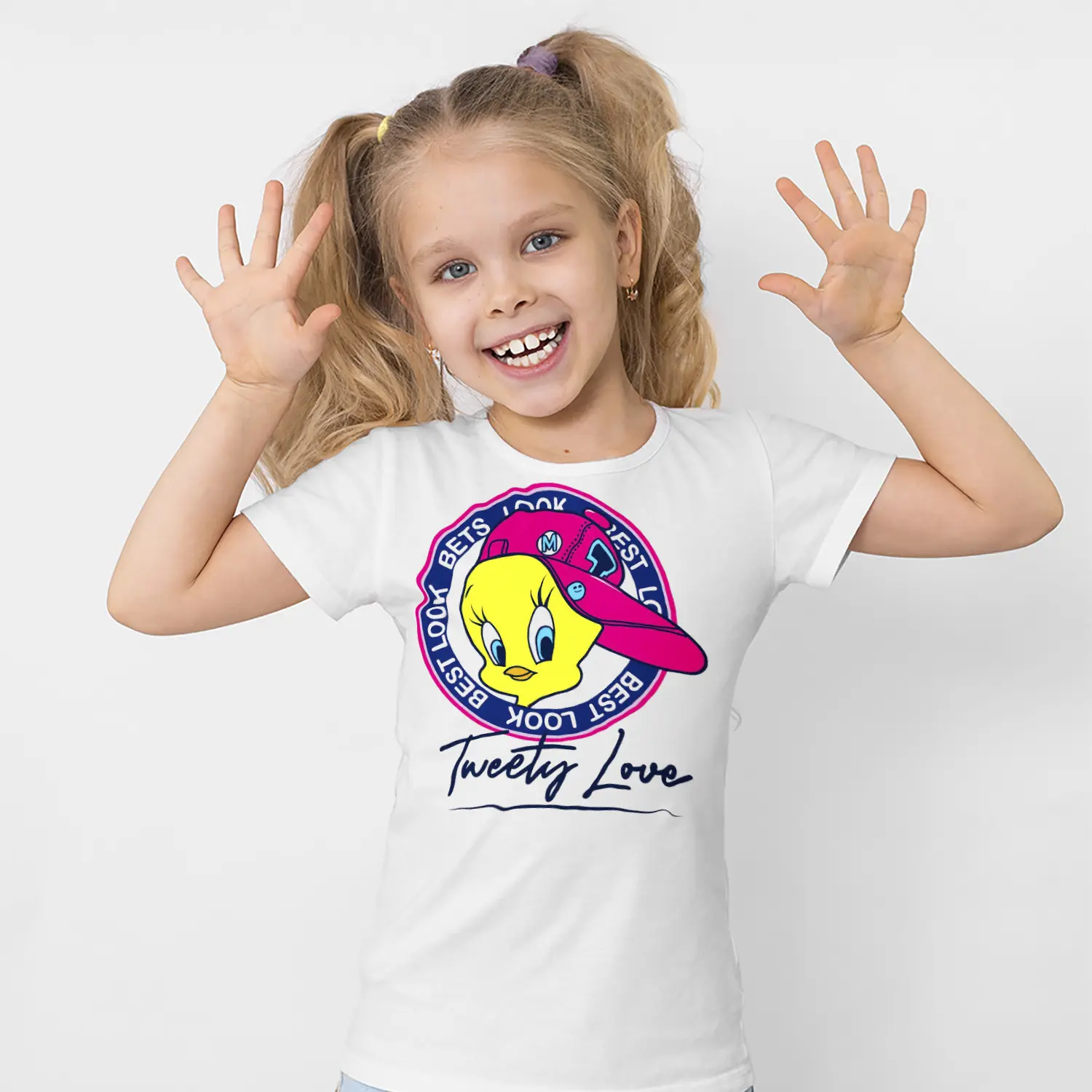 Şapkalı Sarı Kuş Karikatür Tweety Love Yazılı Baskılı Kız Çocuk Tişörtü için 10 değerlendirme