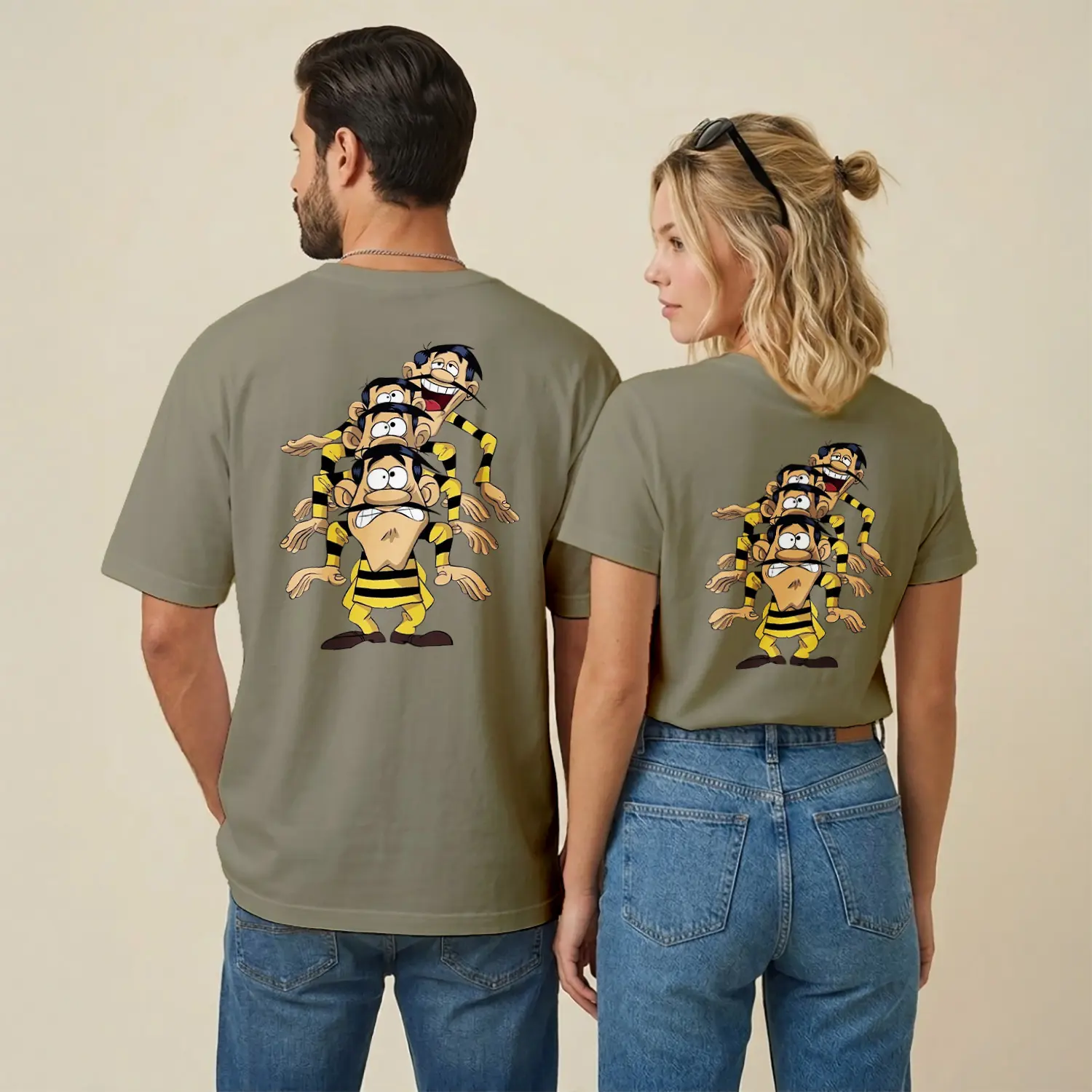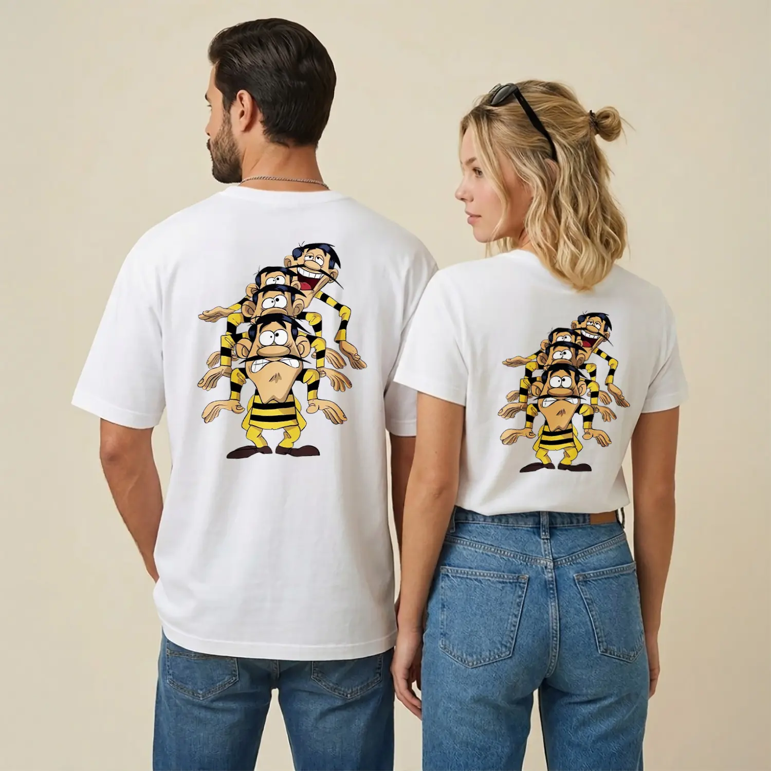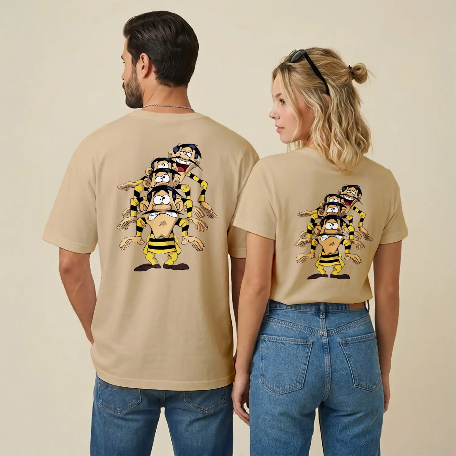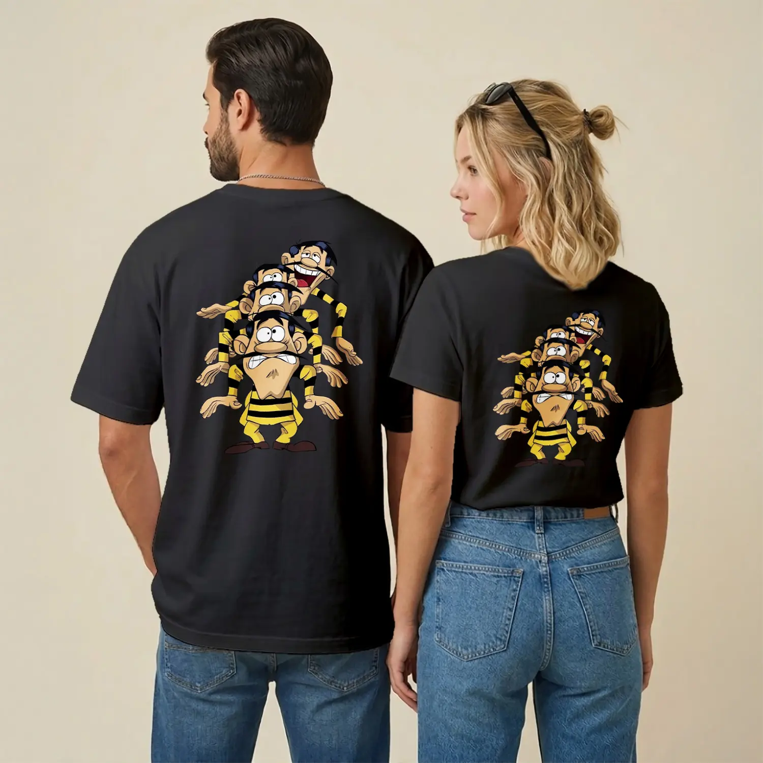 Sarı Siyah Çizgili Komik Çizgi Film Karakteri Üçlü Figür Baskılı Unisex Tişört