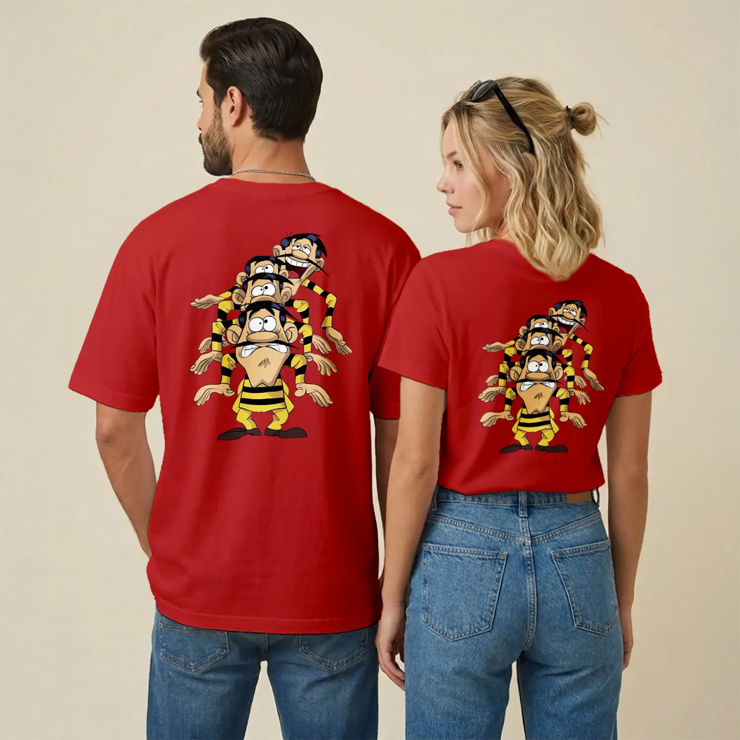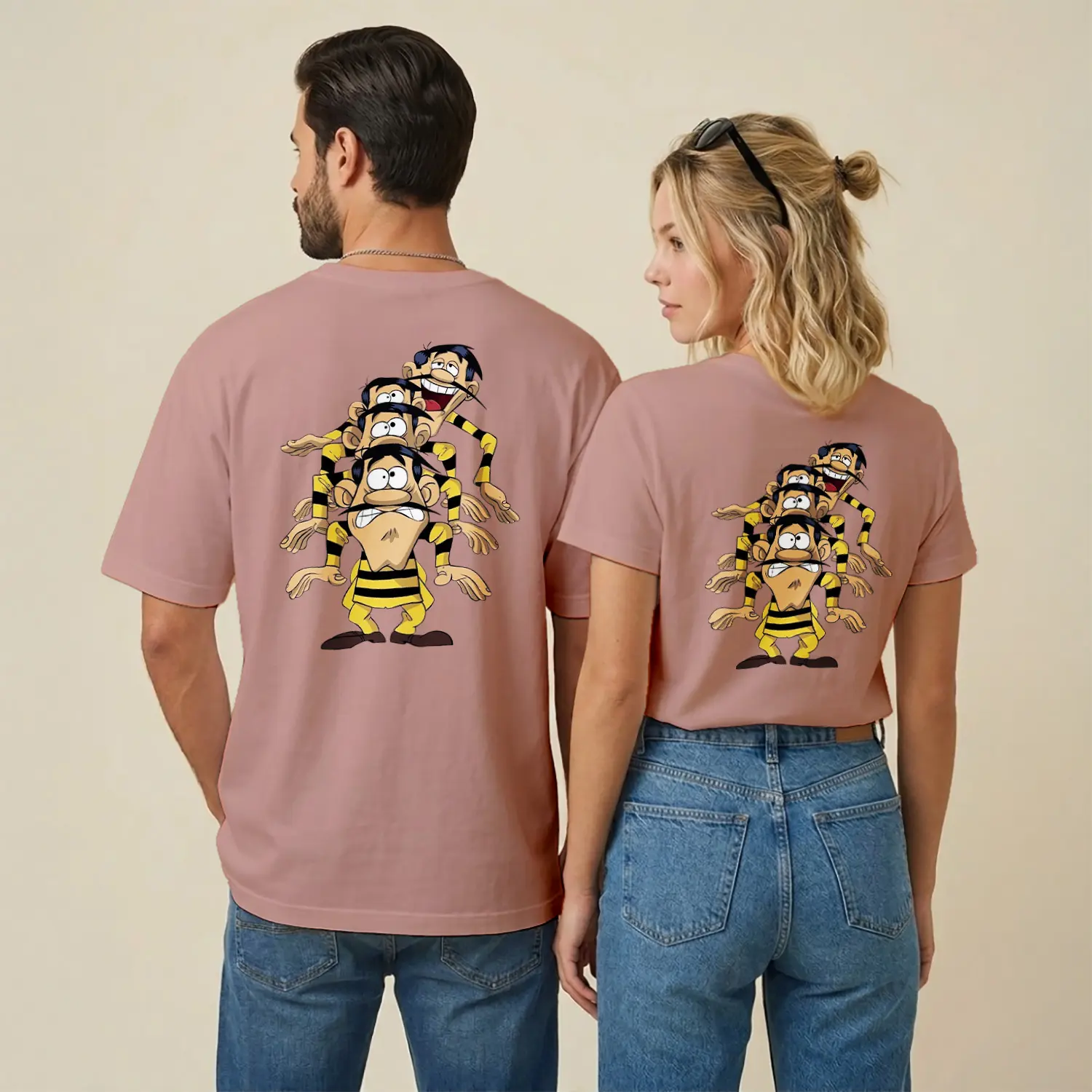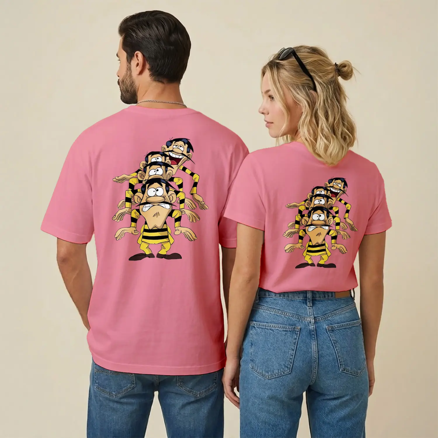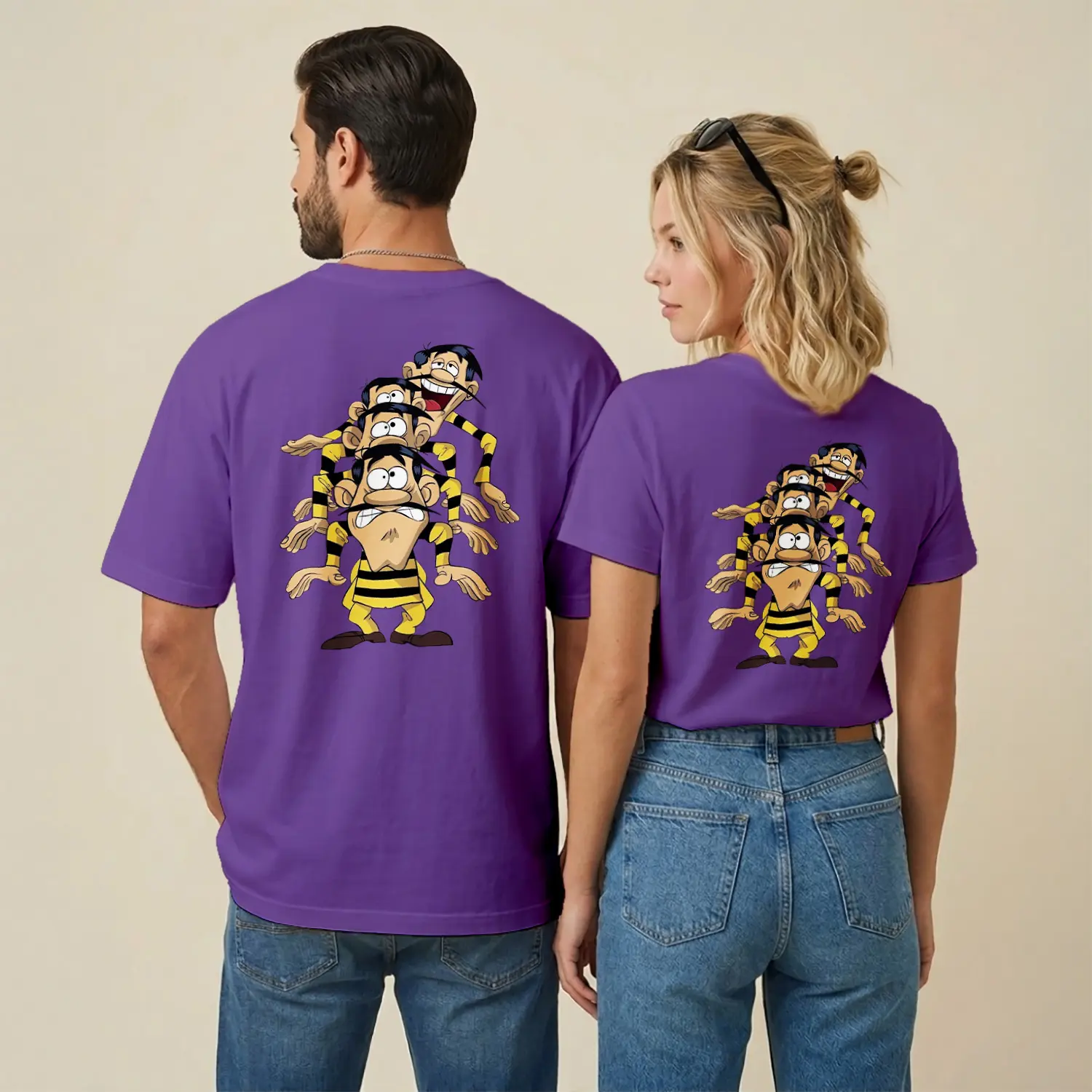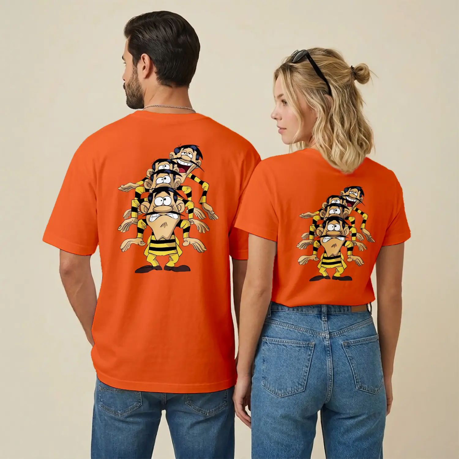 Sarı Siyah Çizgili Komik Çizgi Film Karakteri Üçlü Figür Baskılı Unisex Tişört