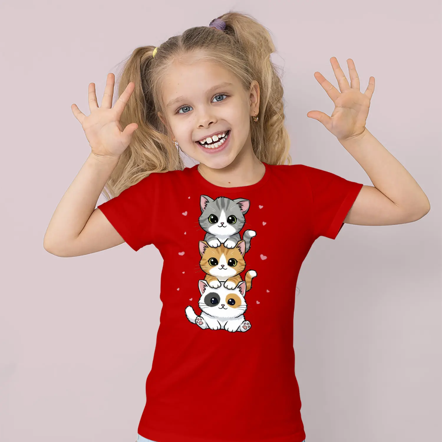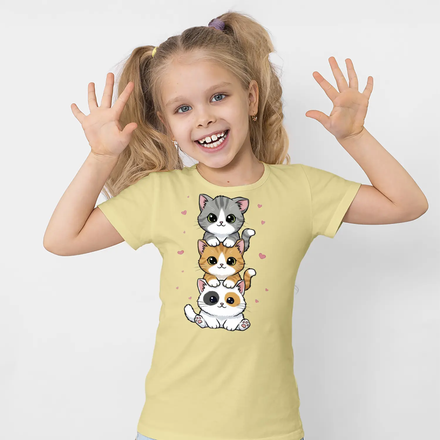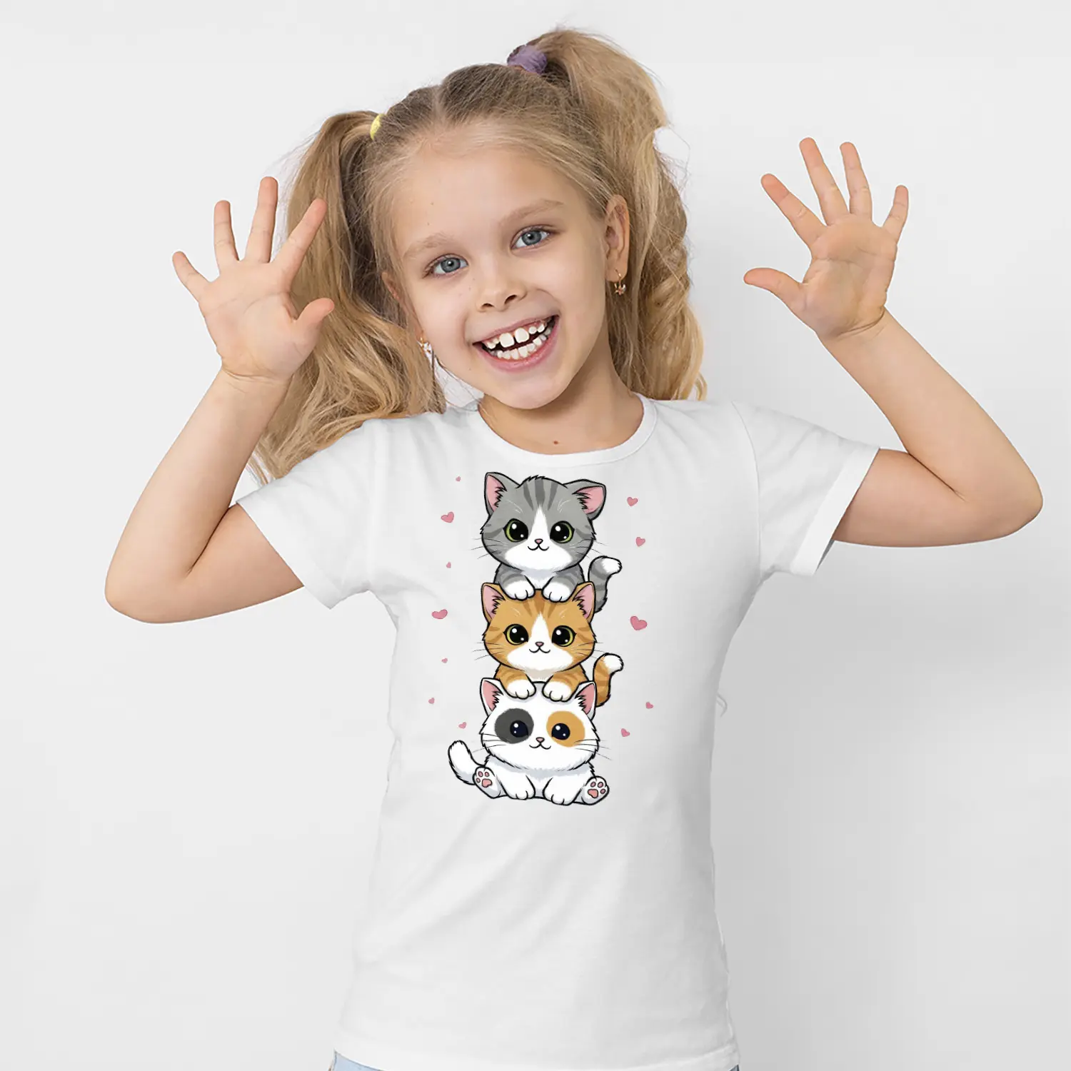 Üst Üste Sevimli Üçlü Kedi Figürlü Baskılı Kız Çocuk Tişörtü