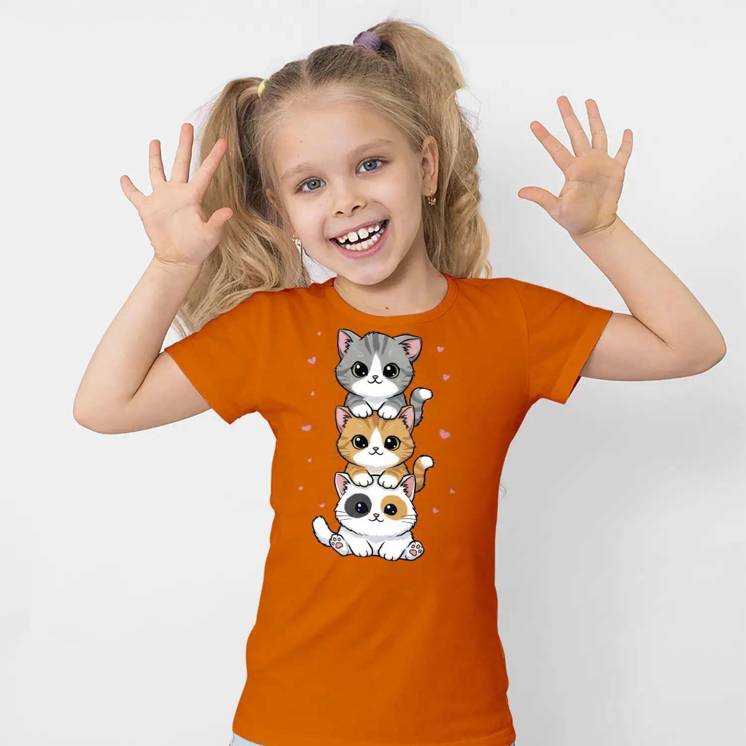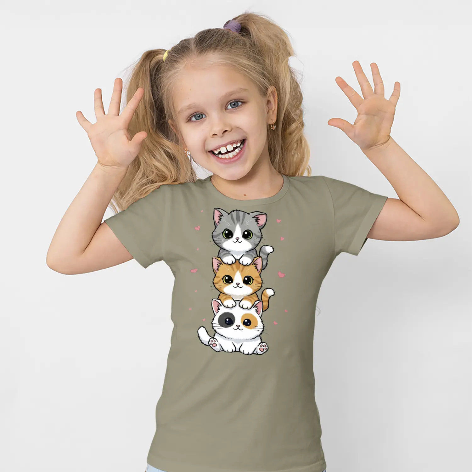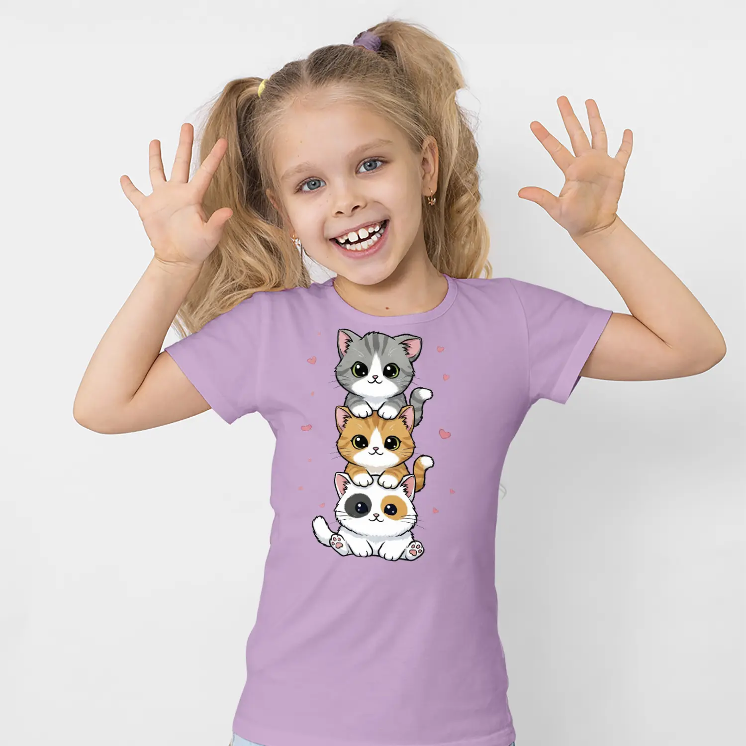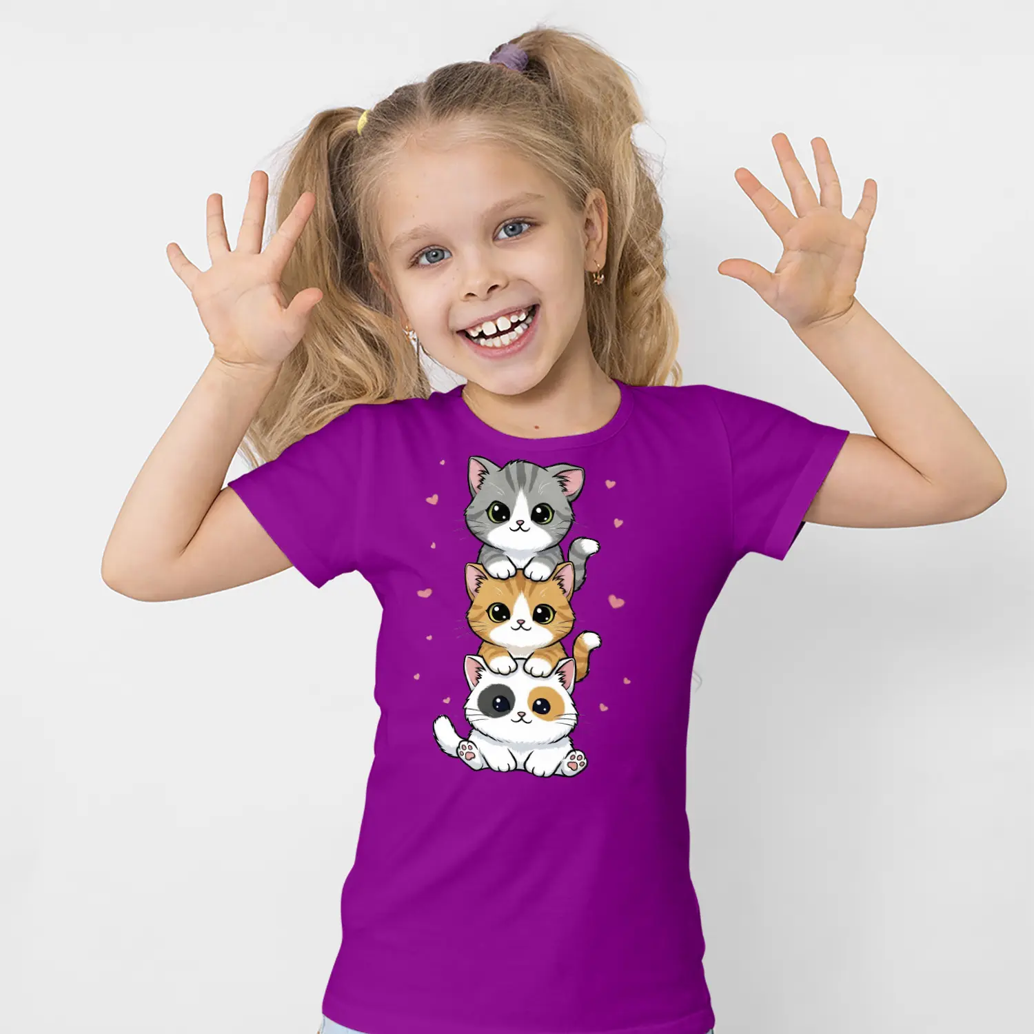 Üst Üste Sevimli Üçlü Kedi Figürlü Baskılı Kız Çocuk Tişörtü